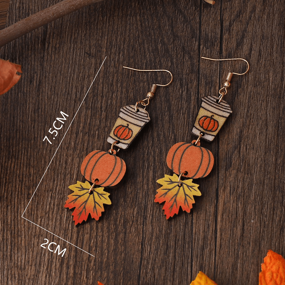 Cartoon Pumpkin and Maple Leaf Wood Drop Earrings for Women