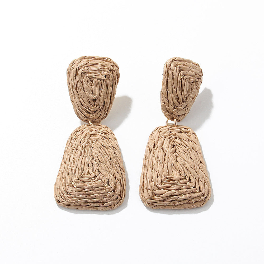 Khaki two-trapezoidal straw rope drop earrings