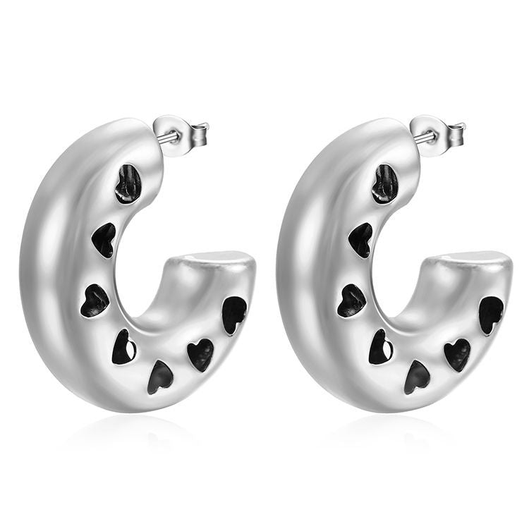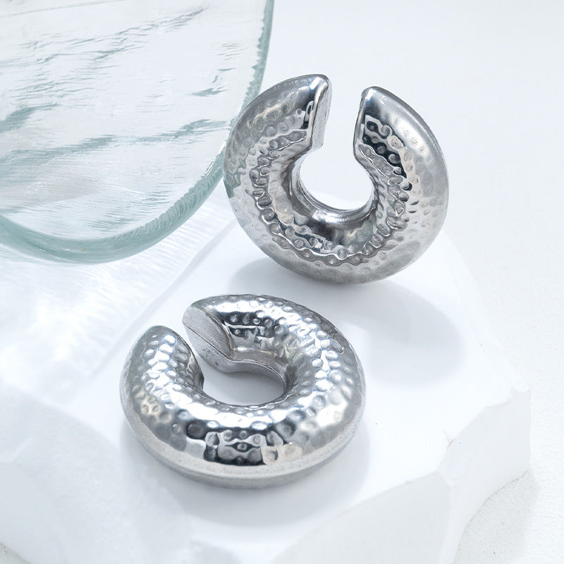 Hammered pattern semi-round hollow earrings steel color MS-227