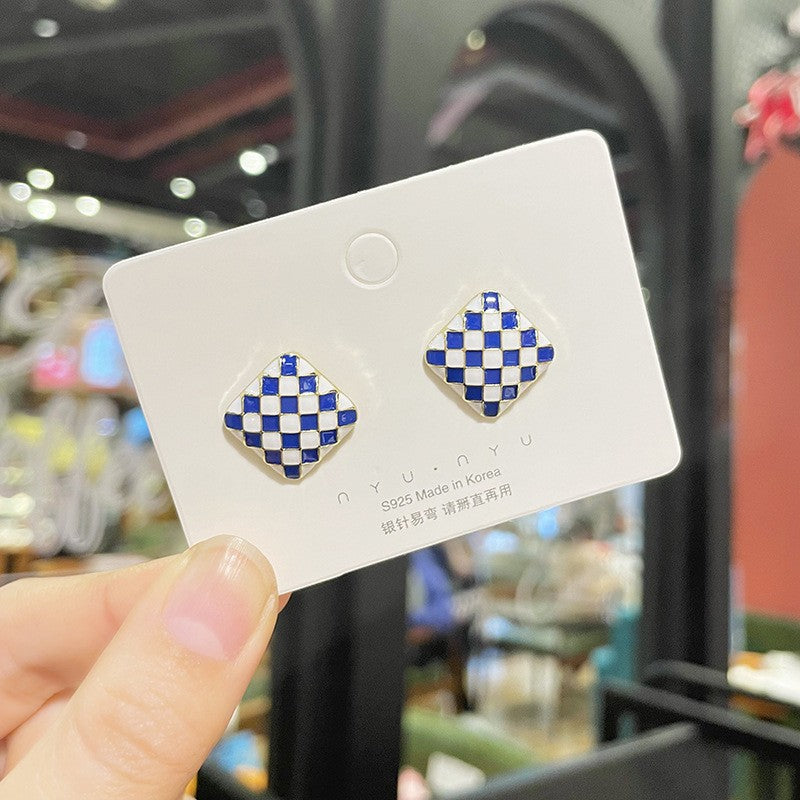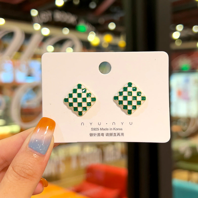1 Pair Geometric Alloy Varnish Artificial Pearl & 925 Silver Needle Green Plaid Heart Stud Earrings