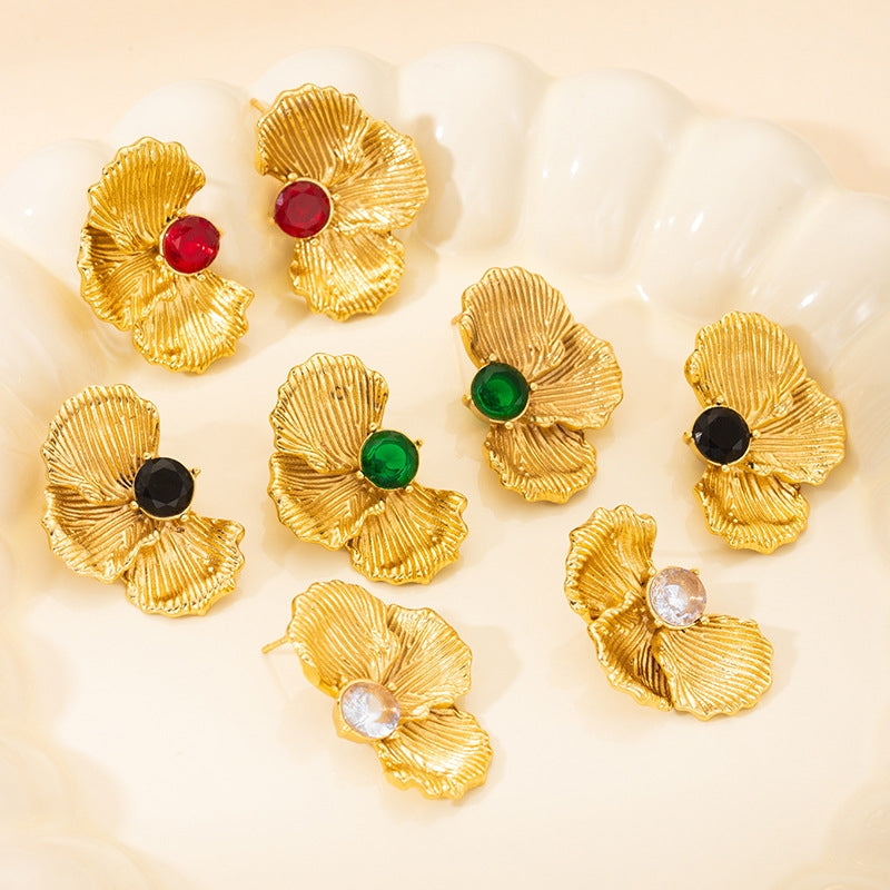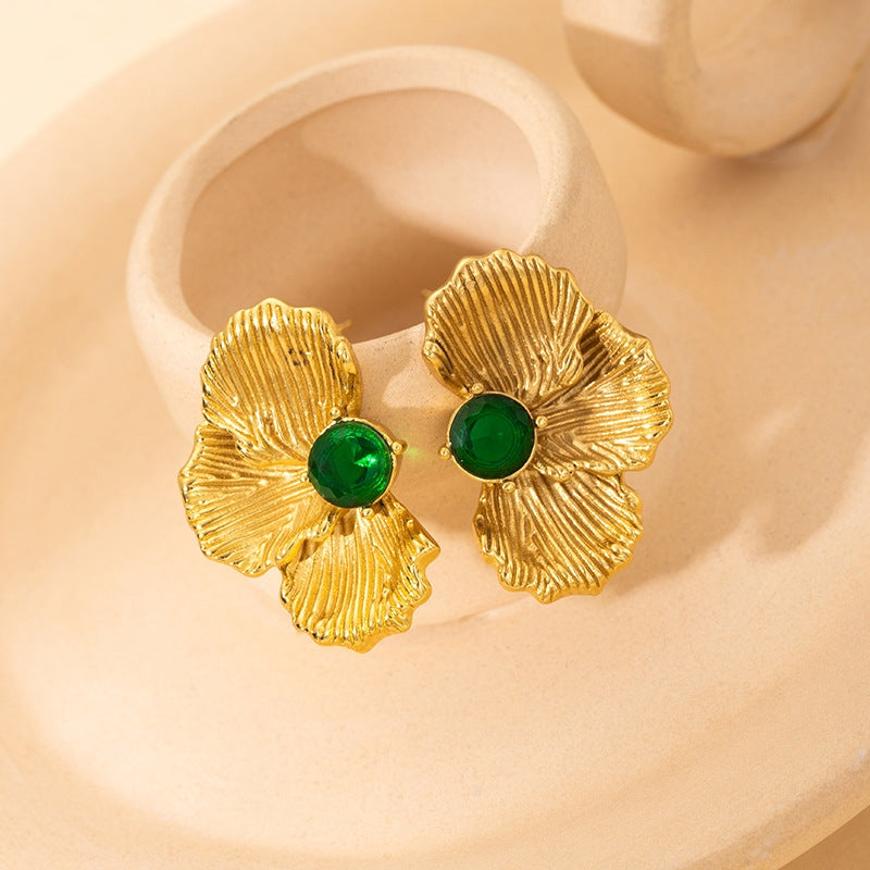 1 Pair Modern Classic Flower Design Green Stone Gold Plated Stainless Steel Stud Earrings