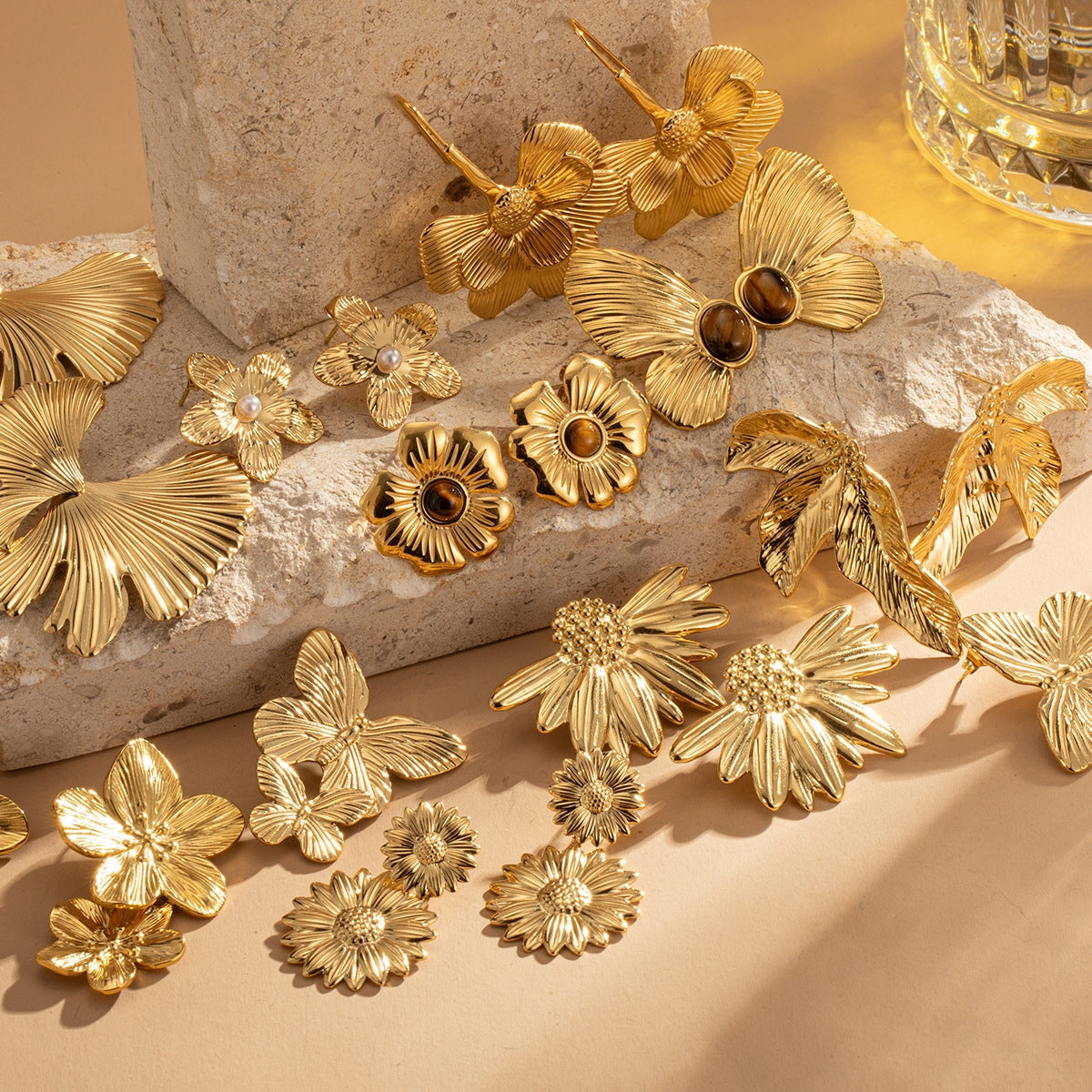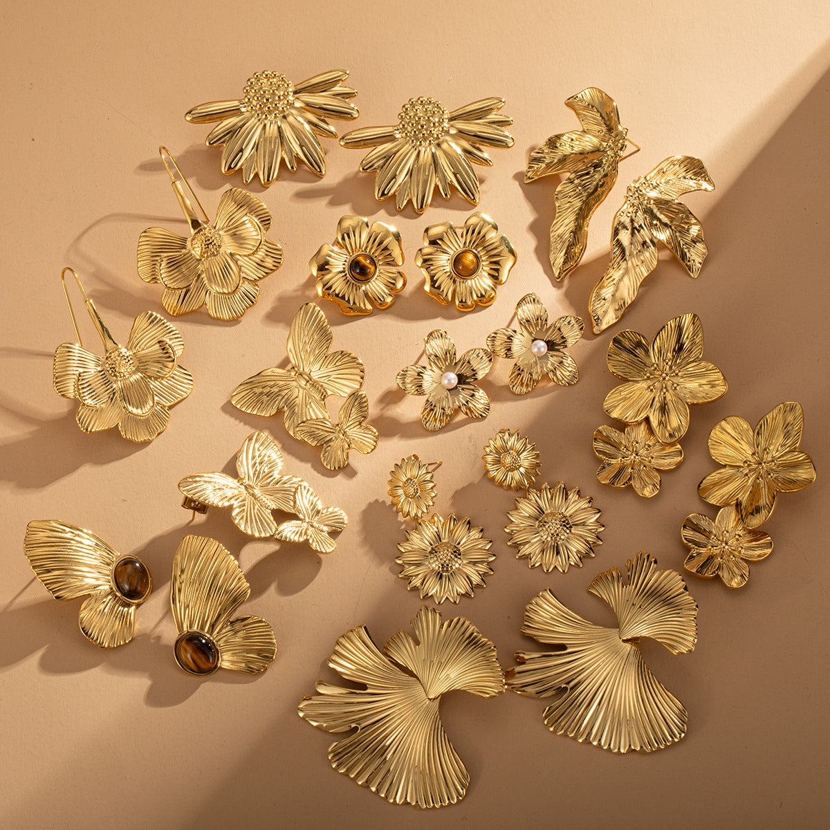 Retro Geometric Butterfly Tiger Eye 18K Gold Plated Titanium Steel Stud Earrings