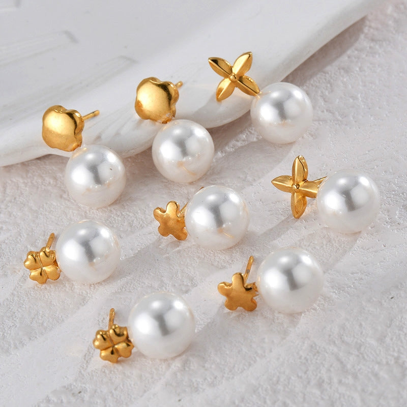 1 Pair Minimalist Flower Inlay 18k Gold Plated Stainless Steel Pearl Rhinestone Stud Earrings