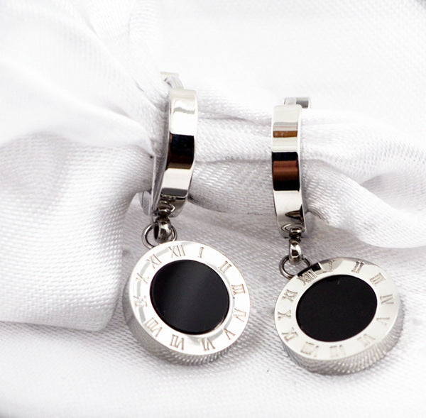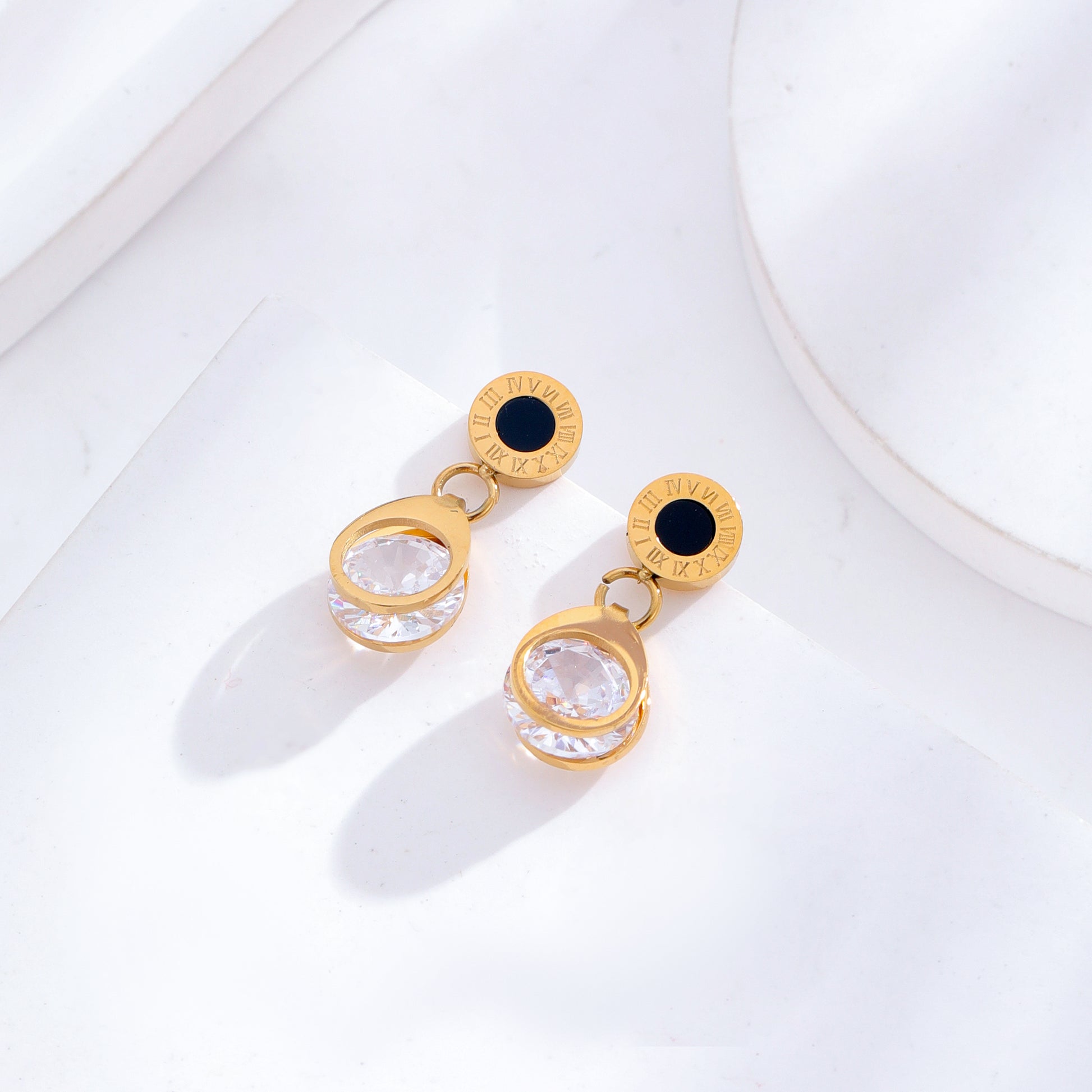 Vintage Roman Round Zircon Titanium Steel 24K Gold Plated Drop Earrings