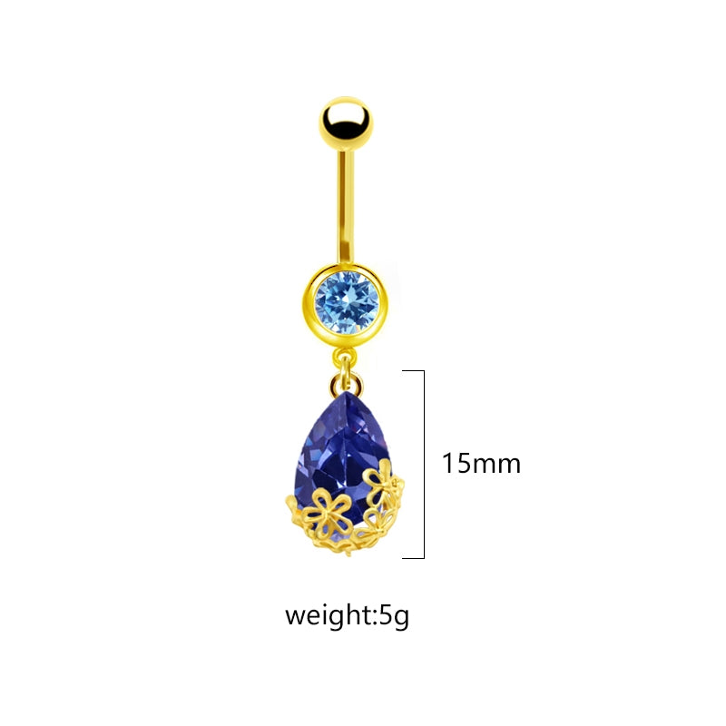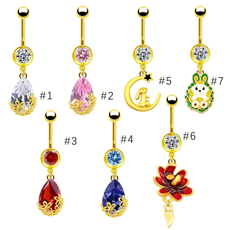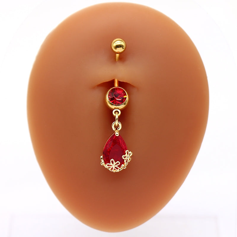 Sweet Pastoral Rose Flower Belly Ring with Colorful Water Droplets and Rhinestones in Stainless Steel and Gold Plated Finish