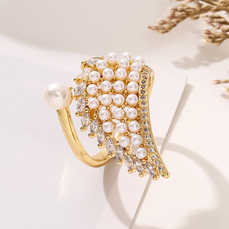 Fashion Angel Wings Zircon Pearl Open Ring in 18k Gold Plated Copper