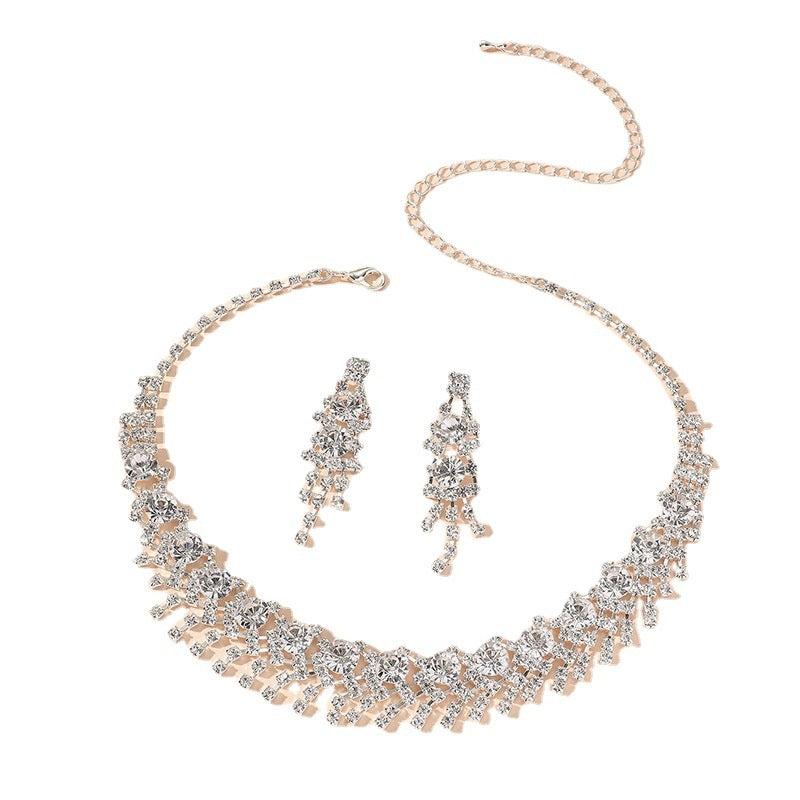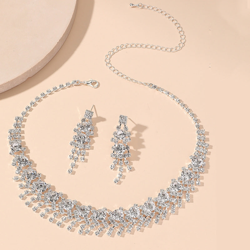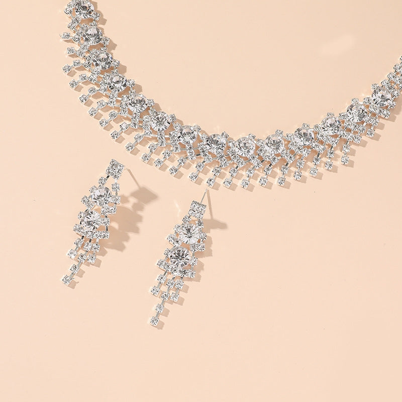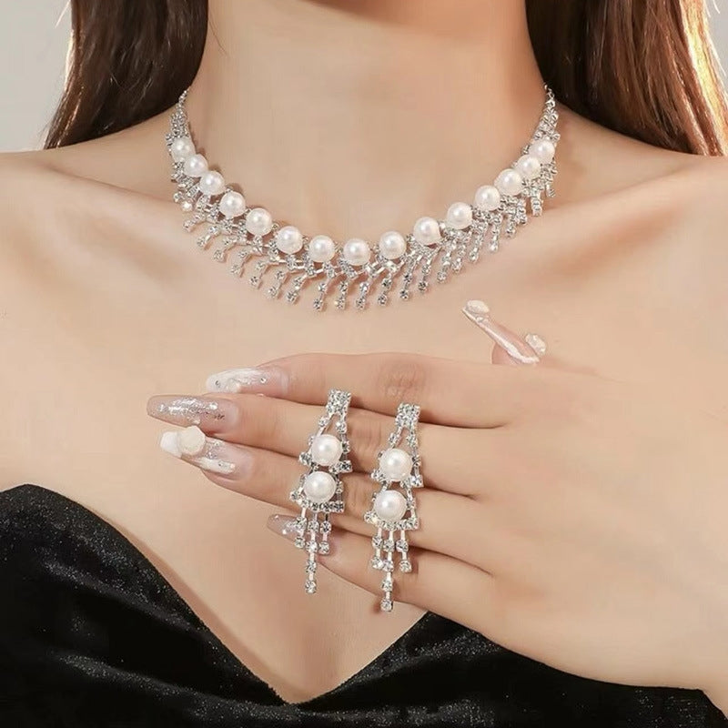 Fashion Geometric Rhinestone Tassel Pearl Necklace and Earrings Set for Women