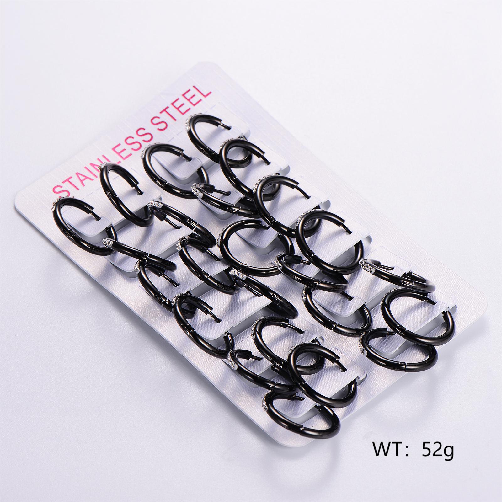12 Pairs Stainless Steel Rhinestone Hoop Earrings - Black Plated Minimalist Design