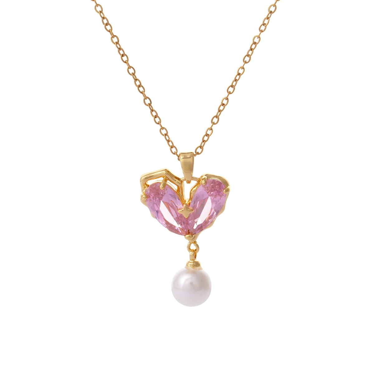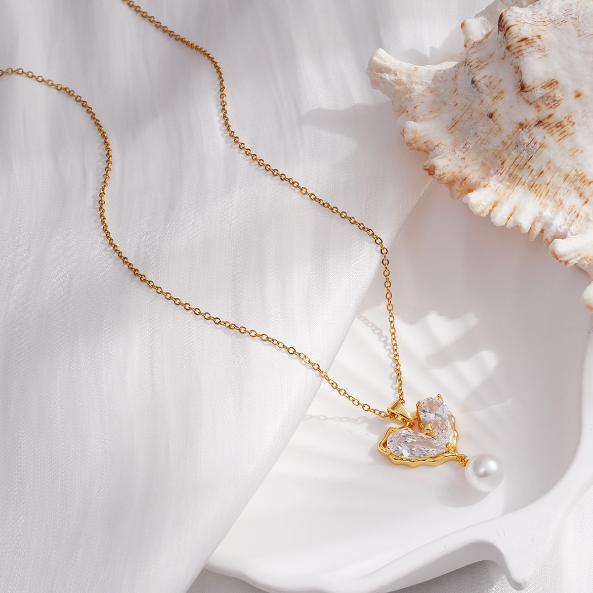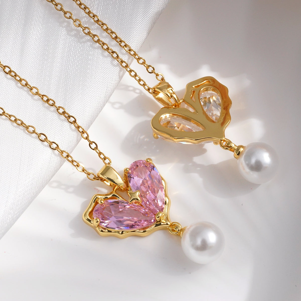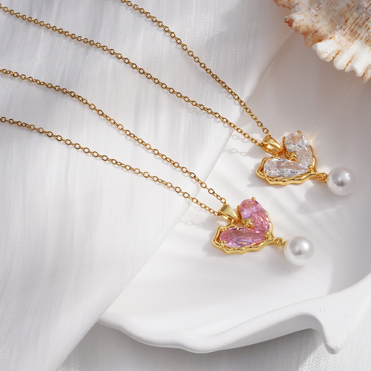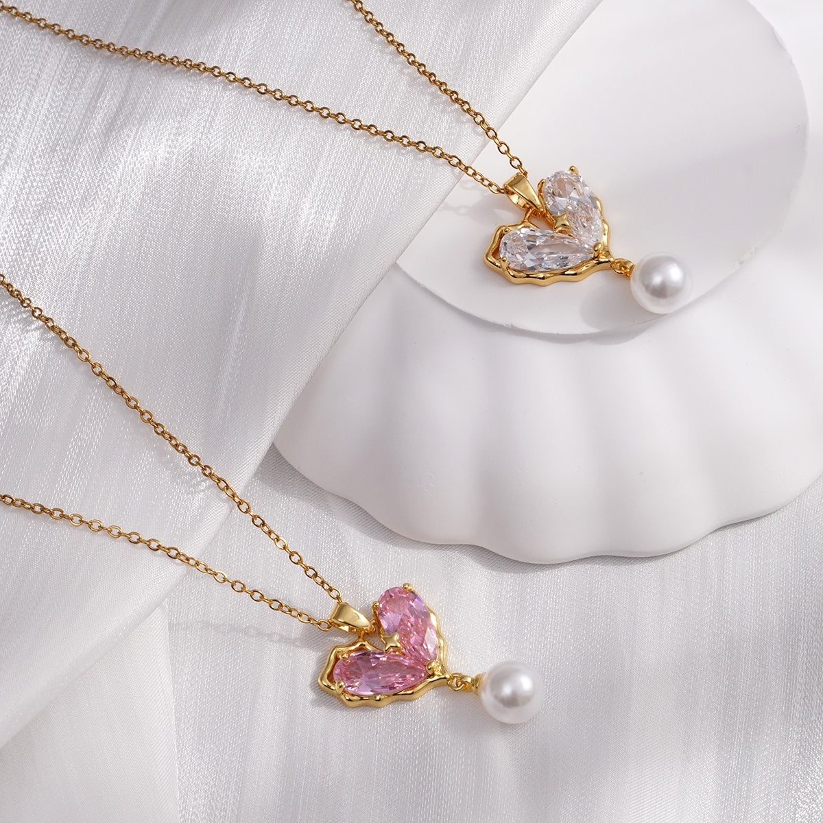 304 Stainless Steel Heart Pendant Necklace with Zirconia and Pearl