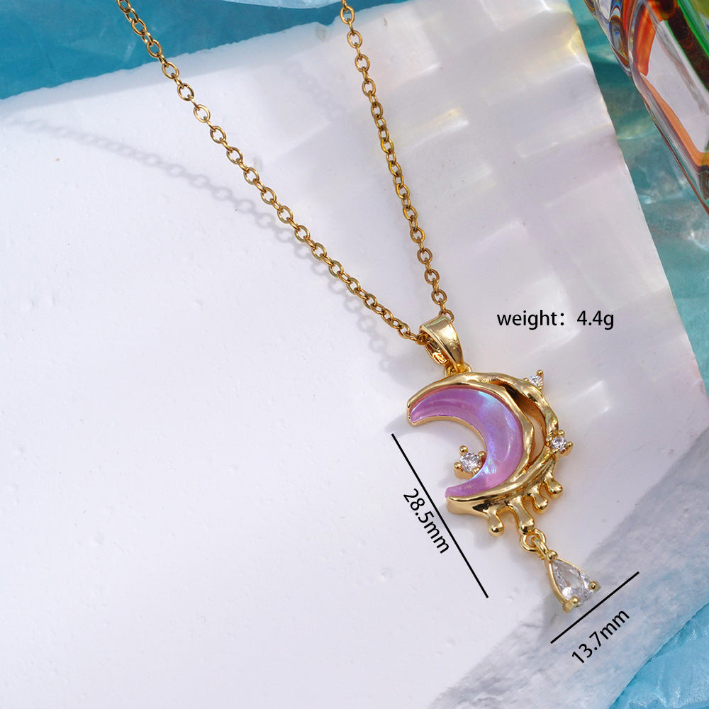 304 Stainless Steel Moon Zircon Pendant Necklace with Gold-Plated Copper Inlay