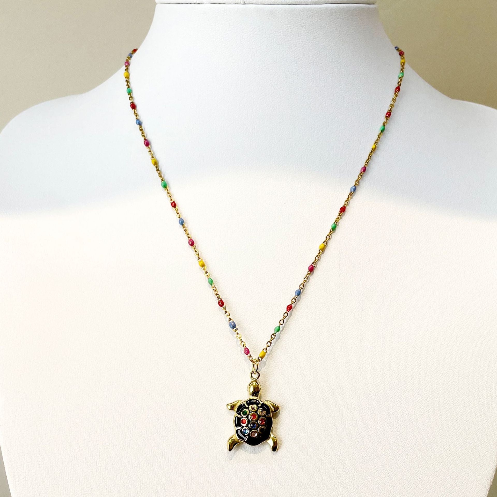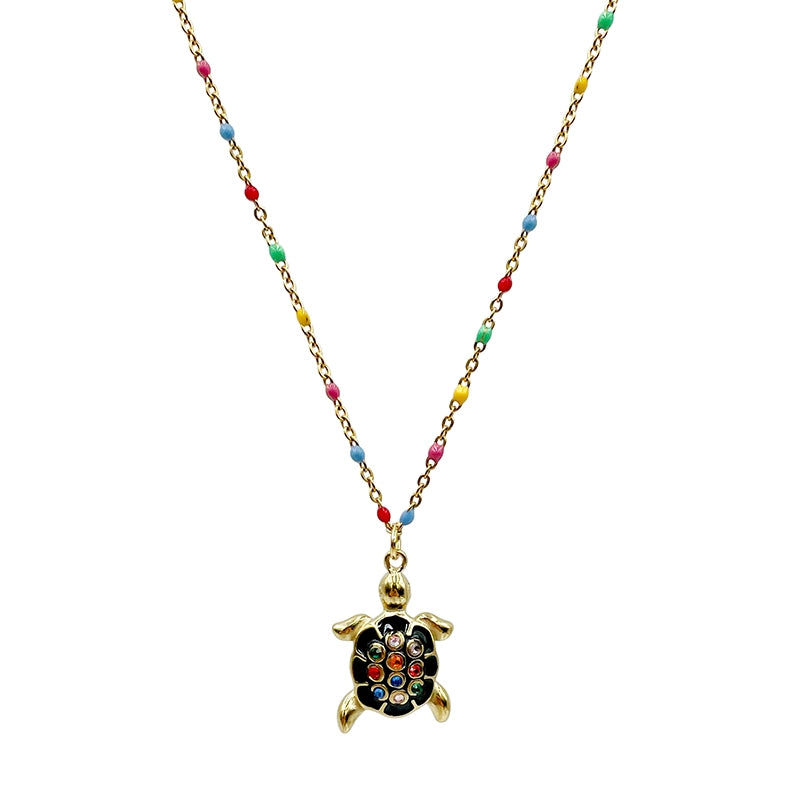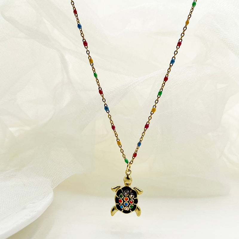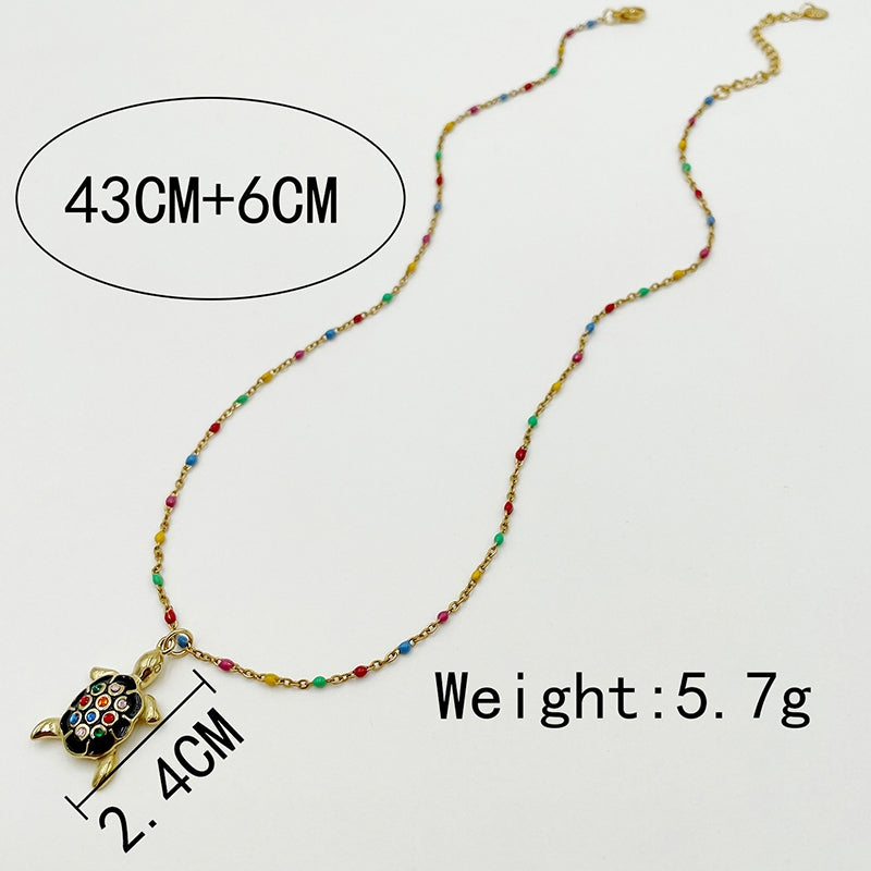304 Stainless Steel Gold Plated Colorful Enamel Tortoise Zircon Pendant Necklace