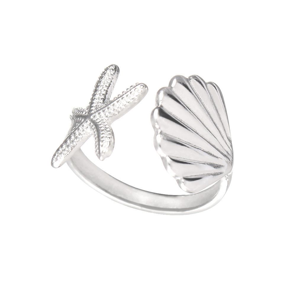 925 Silver Asymmetrical Starfish Shell Open Ring - Japanese Style Beach Vacation Jewelry