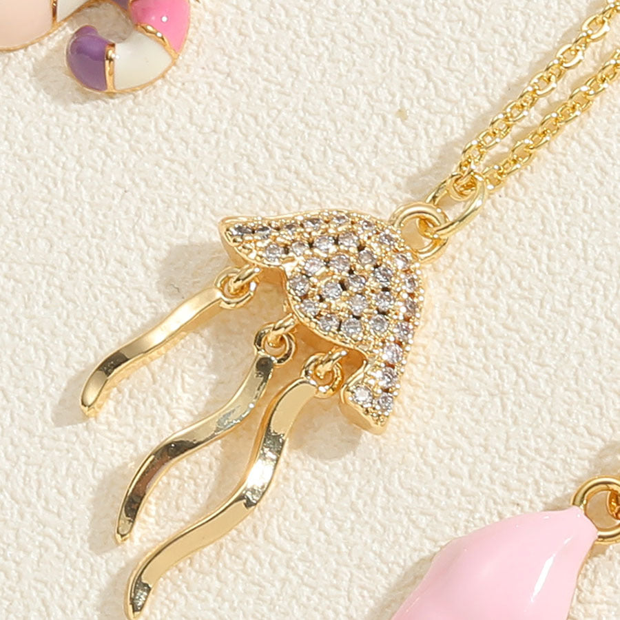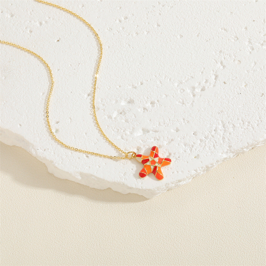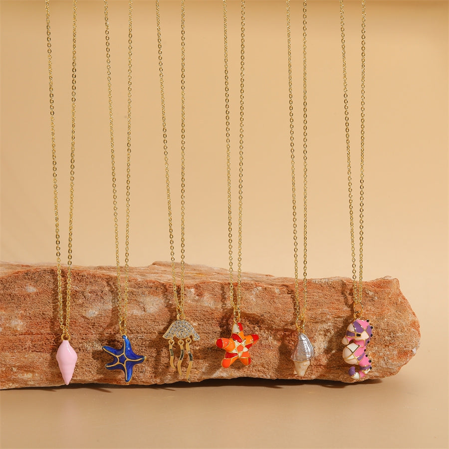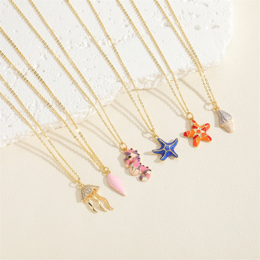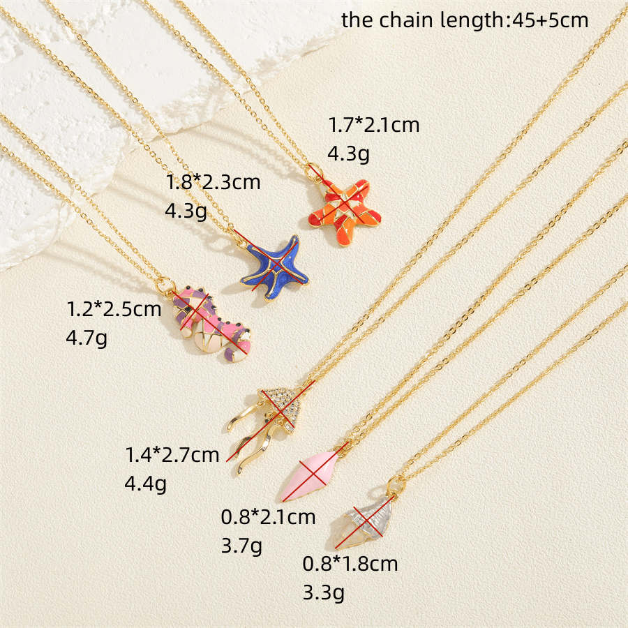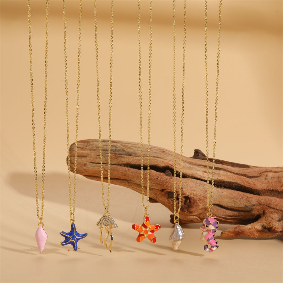 14k Gold Plated Starfish and Shell Zircon Pendant Necklace - Ocean Series