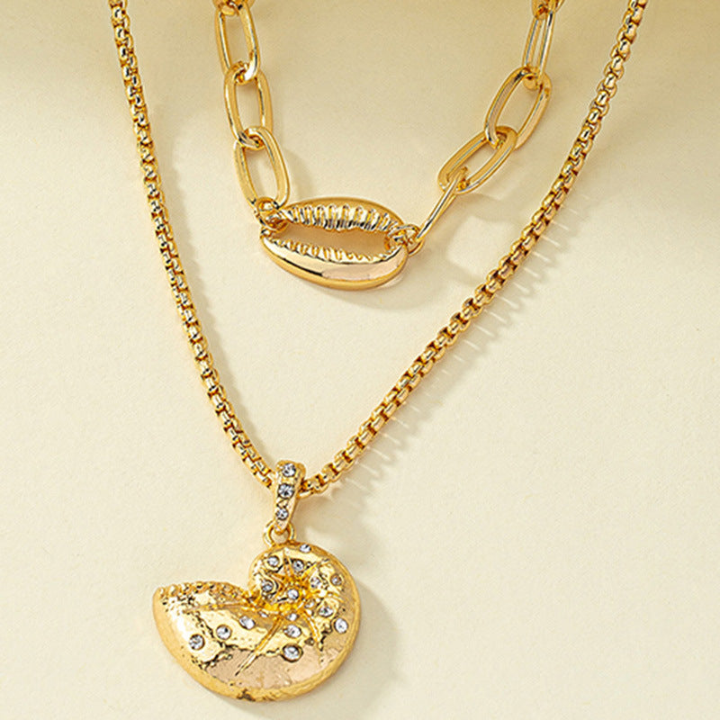 Beach Conch Rhinestone Double Layer Shell Pendant Necklace