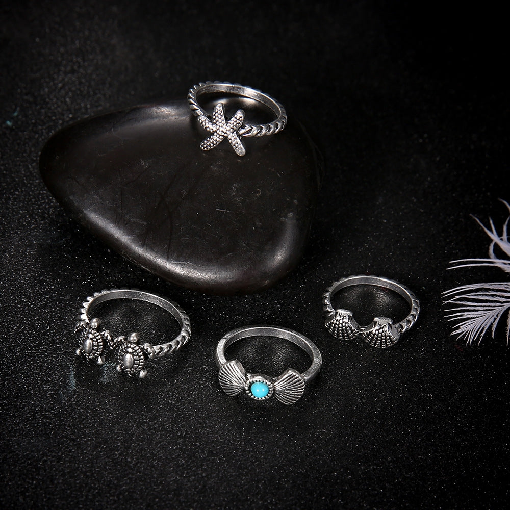 Beach Tortoise Starfish Shell Turquoise Ring Set for Women