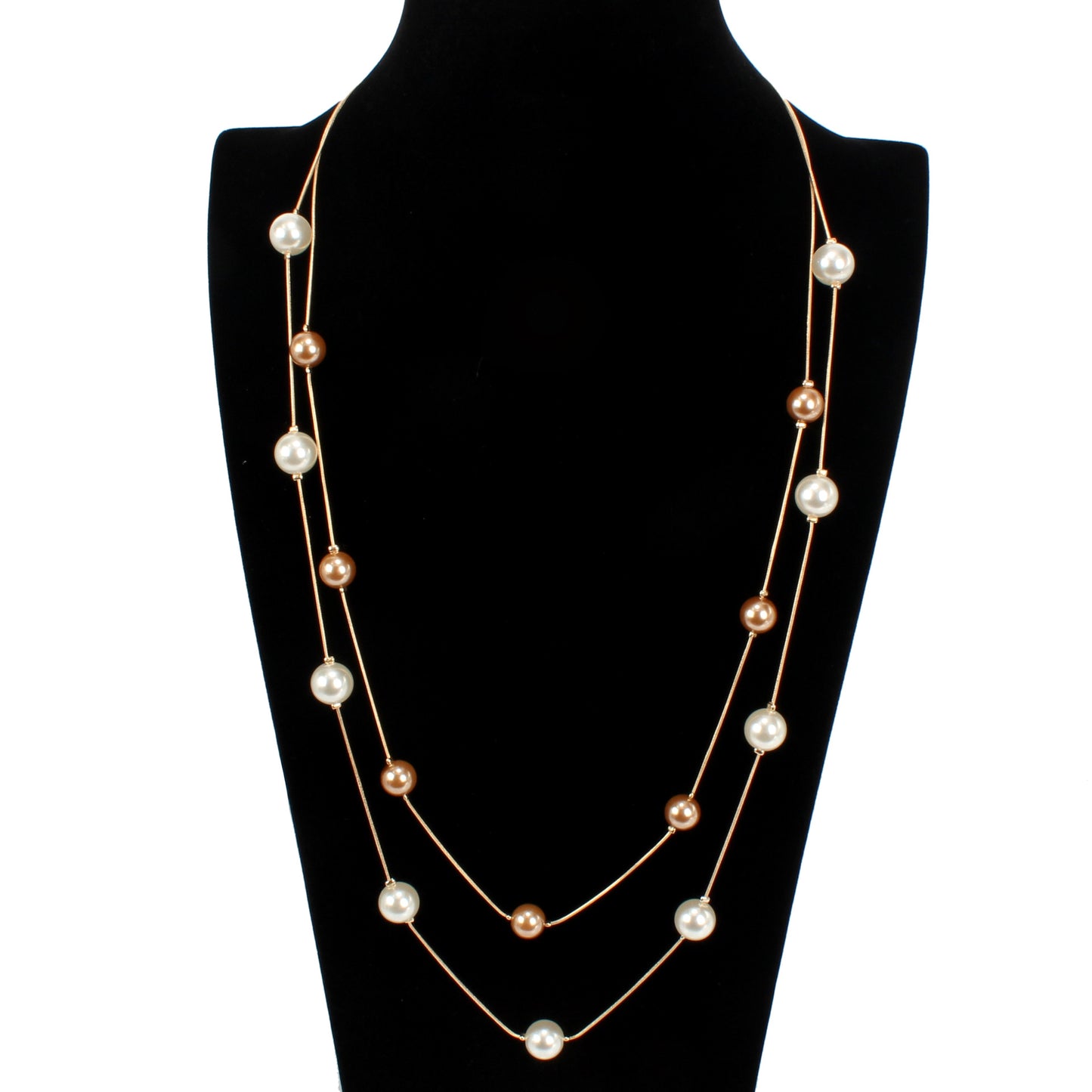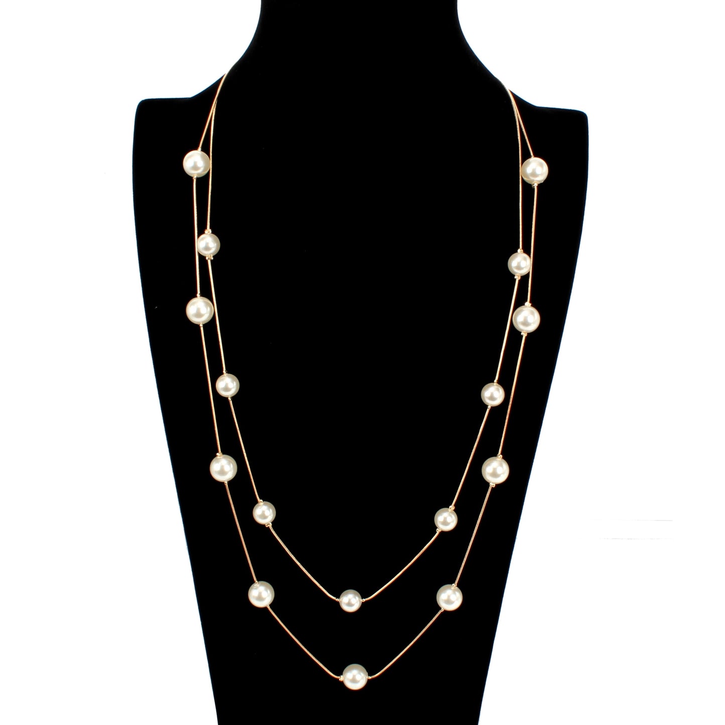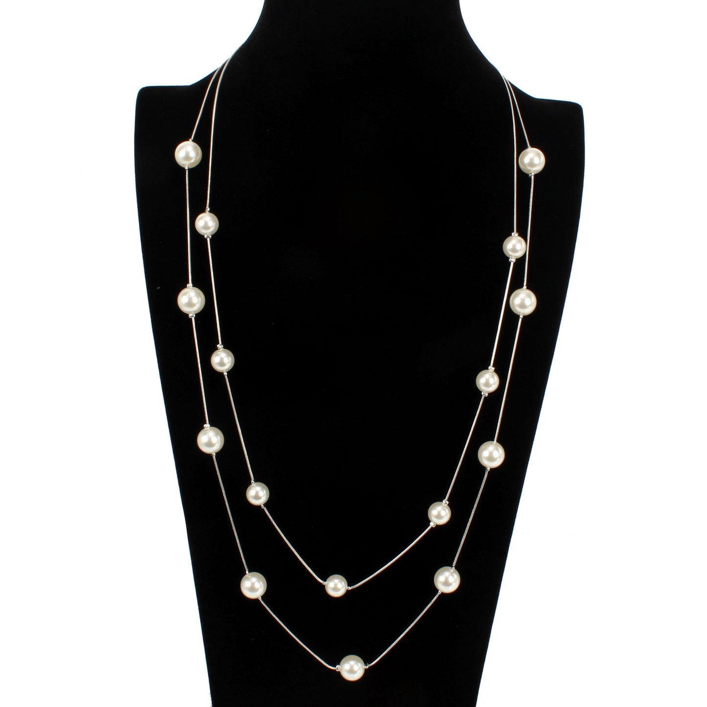 Korean Geometric Double Layer Pearl Necklace - White Alloy Long Sweater Chain
