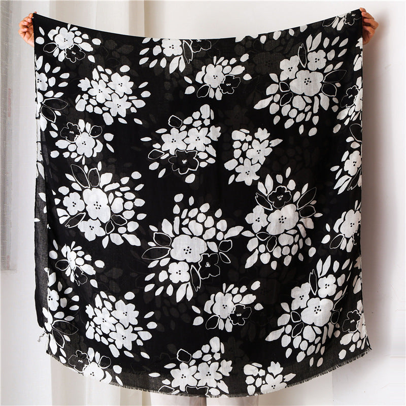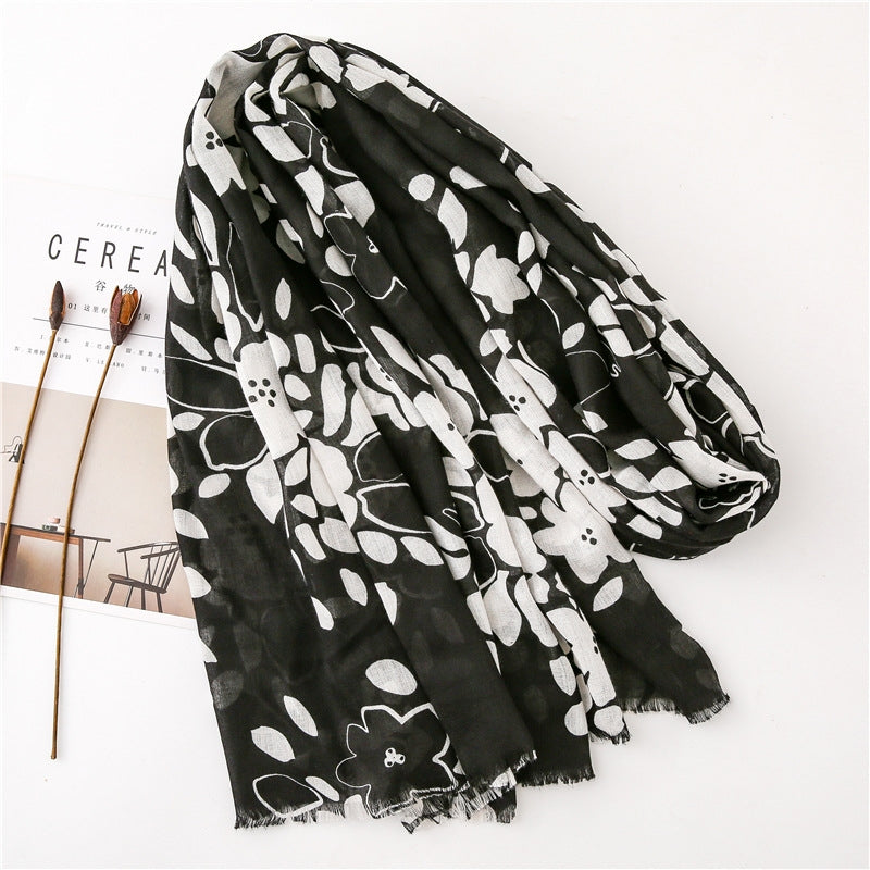 Black and White Printed Cotton Linen Long Scarf Shawl