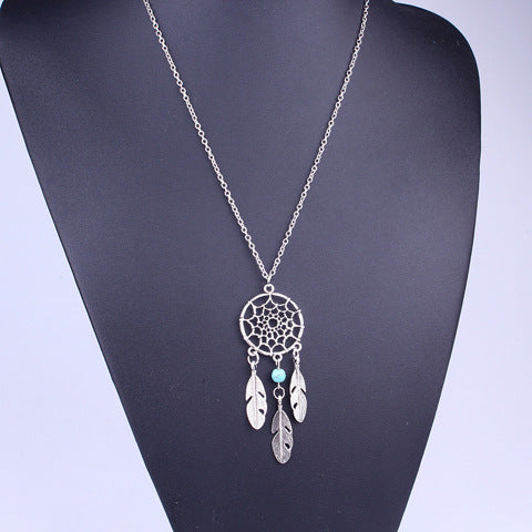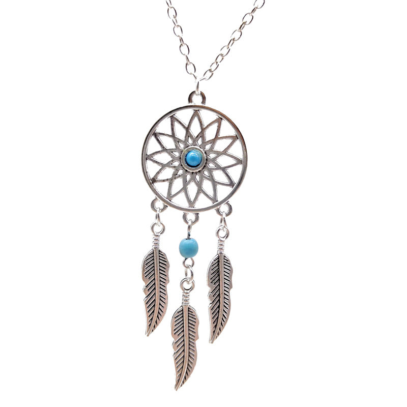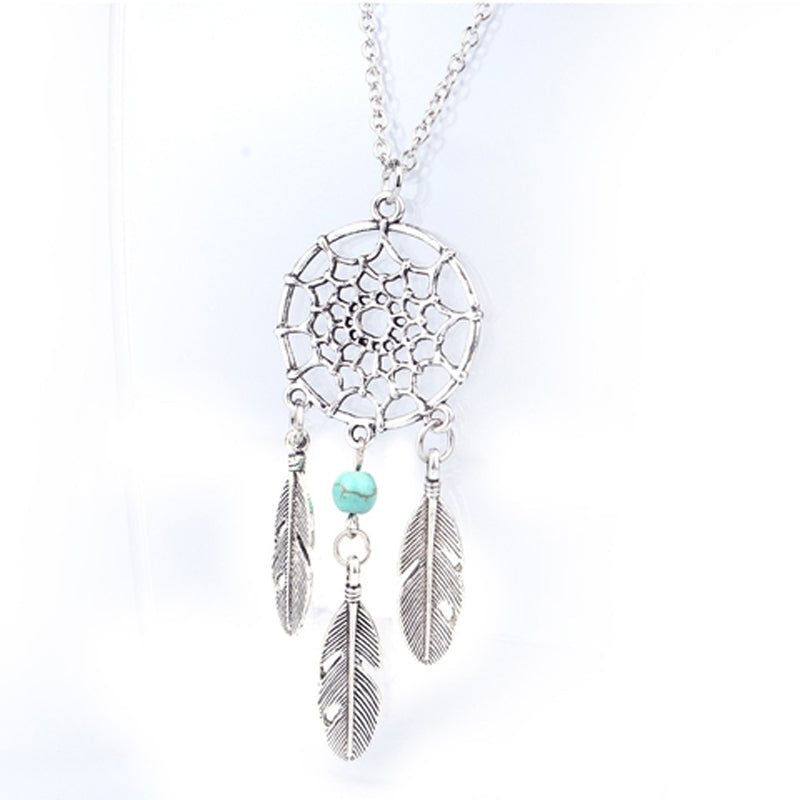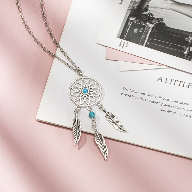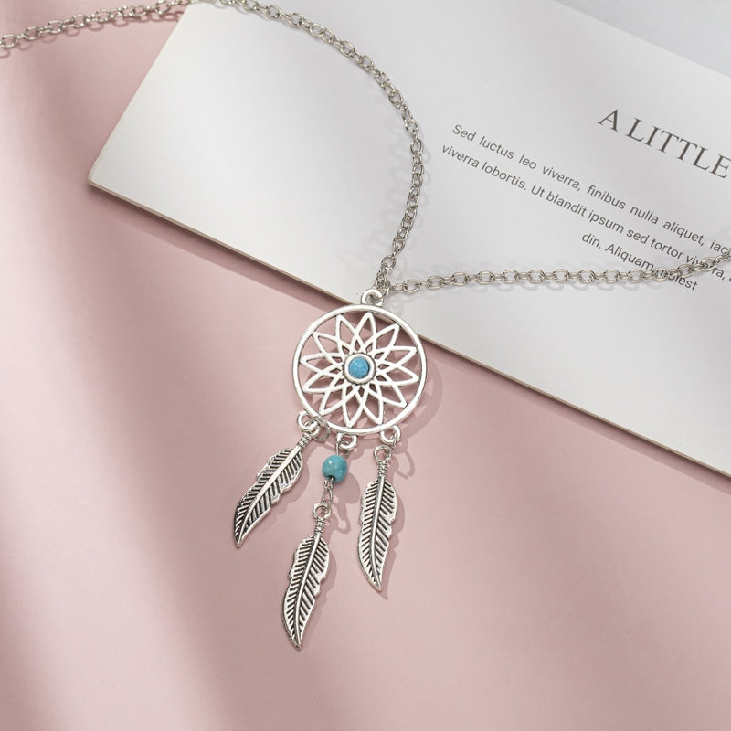 Bohemian Feather Dreamcatcher Pendant Necklace with Turquoise Inlay
