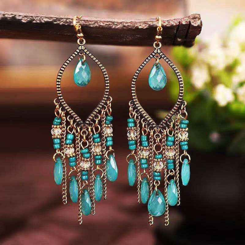 Bohemian Geometric Gold-Plated Tassel Resin Drop Earrings