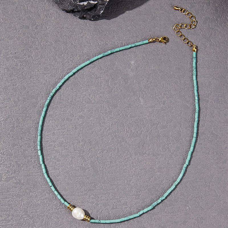 Casual Vintage Blue Turquoise Beaded Necklace with Freshwater Pearl and Natural Stone