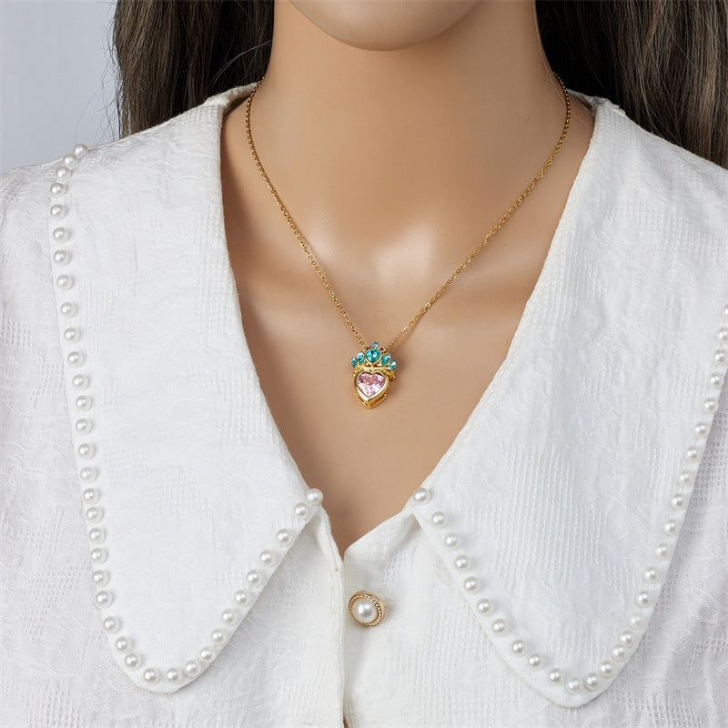 Gold Plated Heart Crown Pendant Necklace - Titanium Steel Pink Clavicle Chain