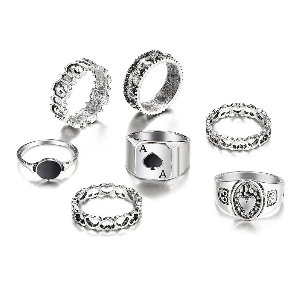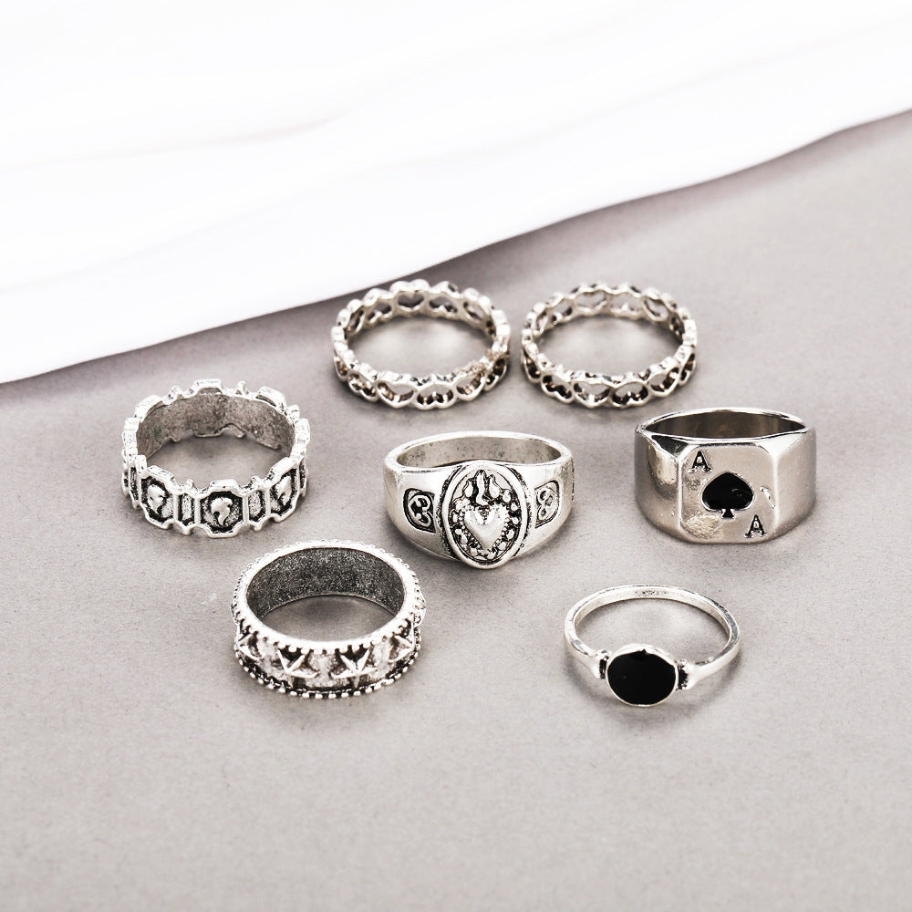 Retro Spades Playing Card Ring Set - Creative Personality Joint Rings, 7-Piece Collection