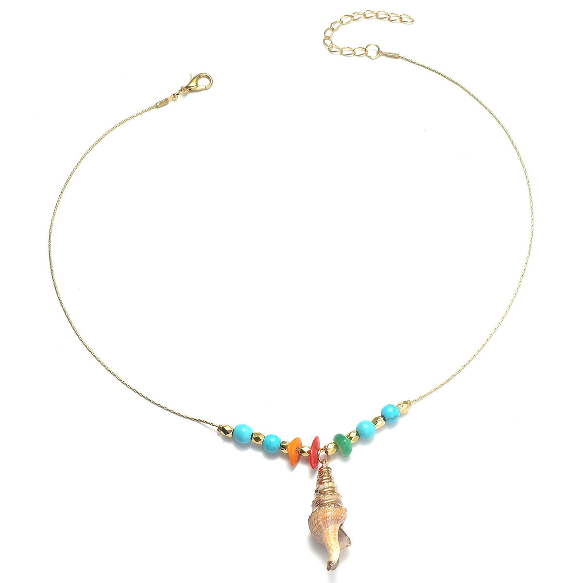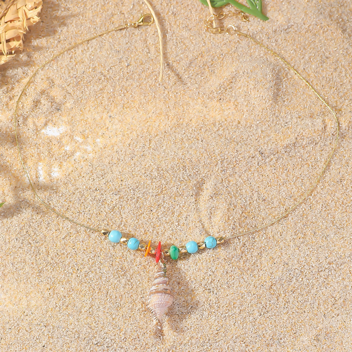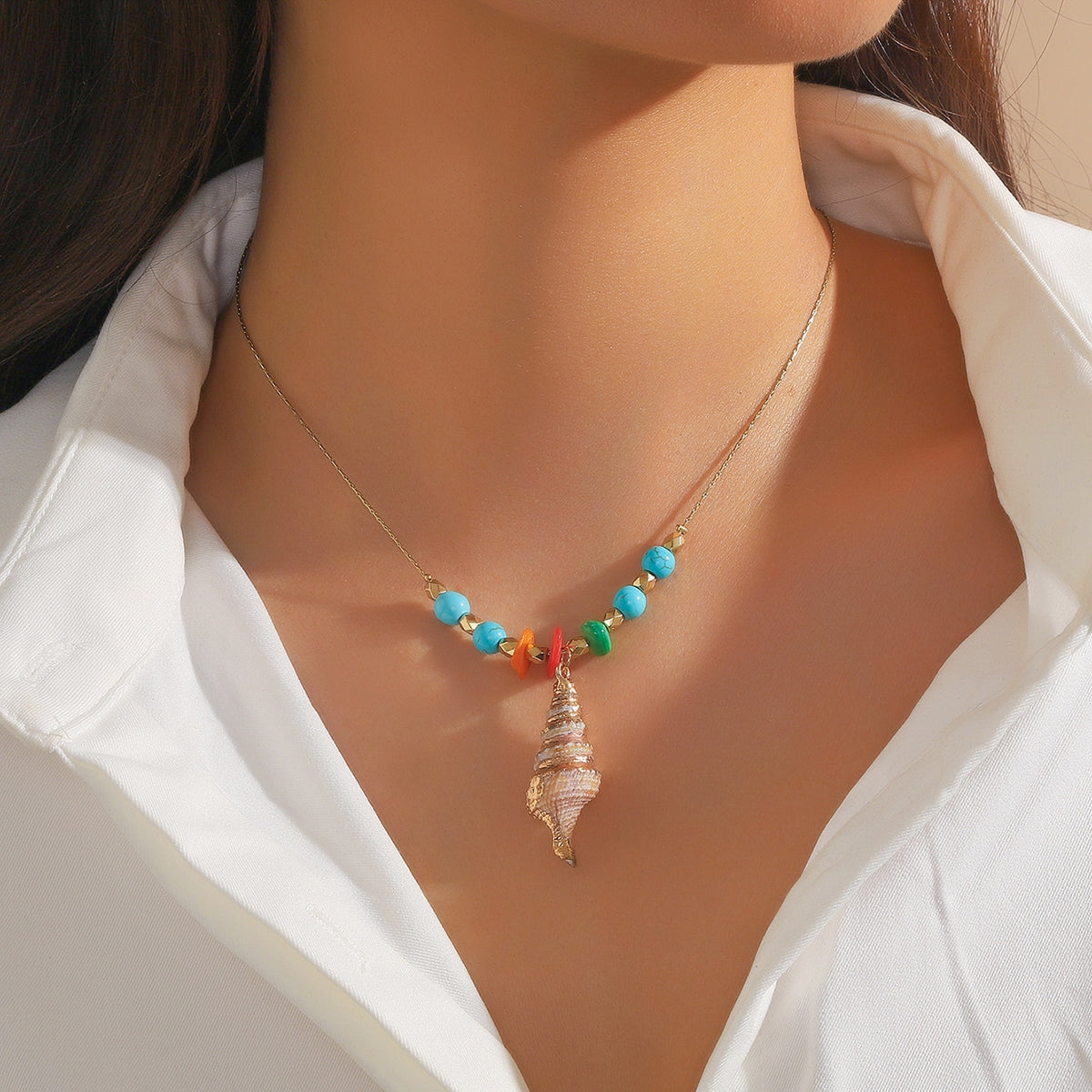 Elegant Shell Pendant Necklace with Turquoise Beads and Alloy Chain
