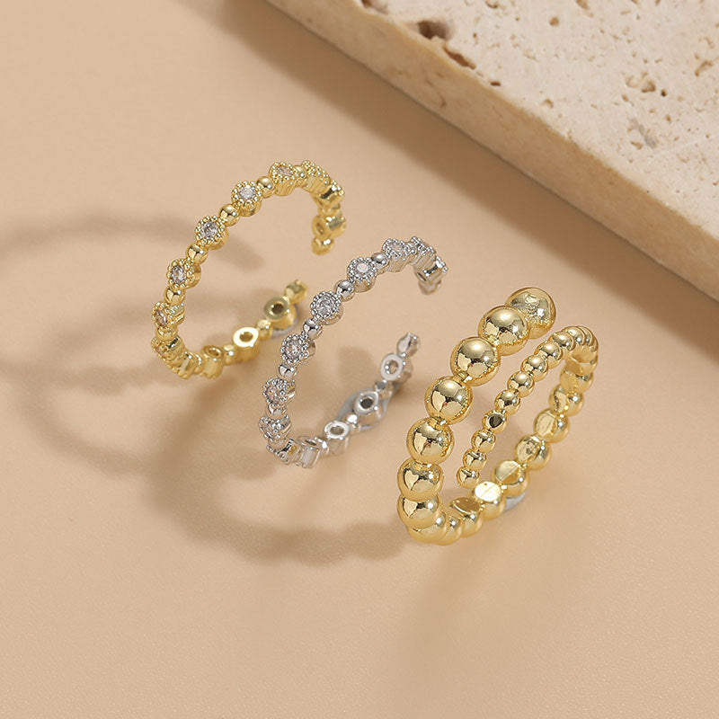 Elegant Minimalist 14K Gold Plated Copper Zircon Beaded Open Ring