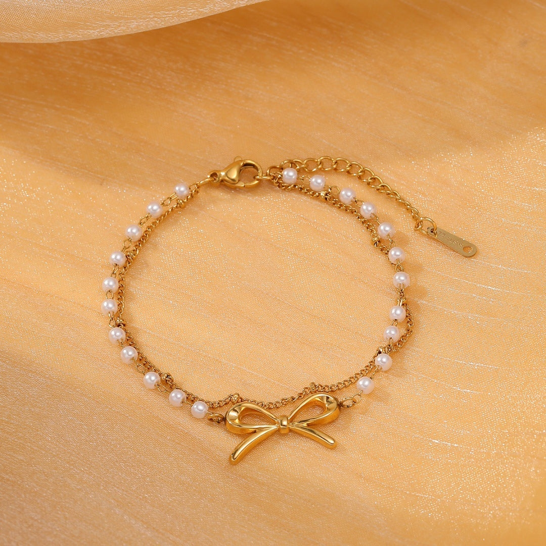 Elegant Titanium Steel Bow Knot Pearl Bracelet - 18K Gold-Plated Women's Jewelry