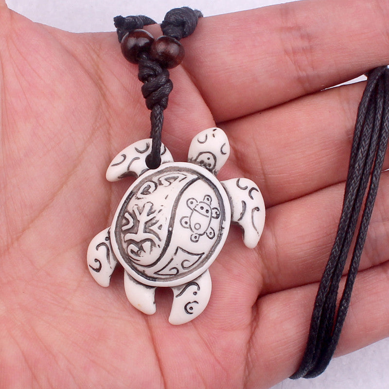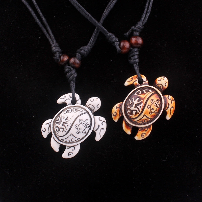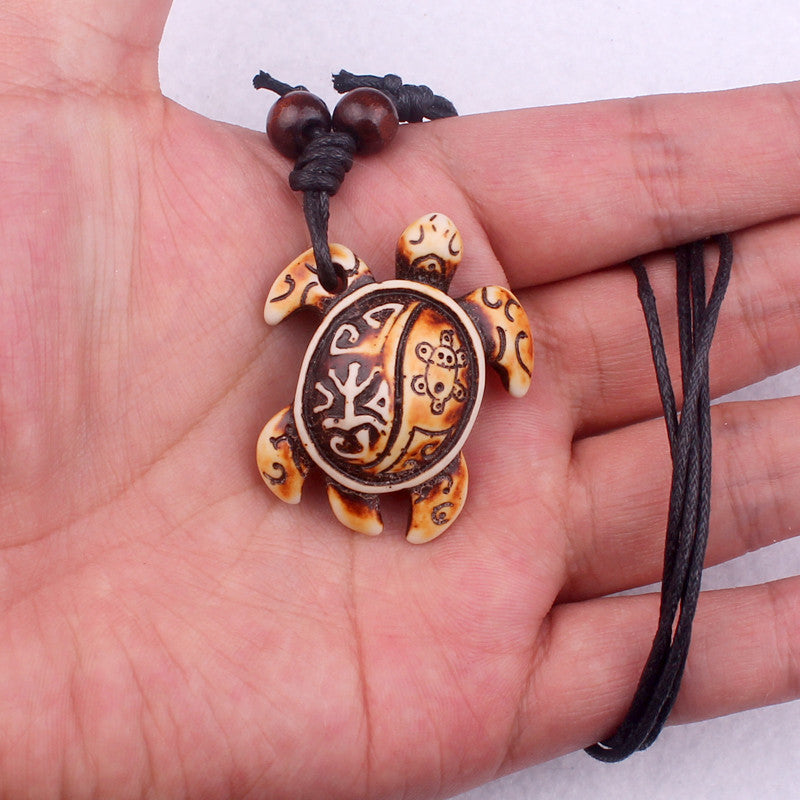 Ethnic Tortoise Resin Pendant Necklace with Faux Bone Carving