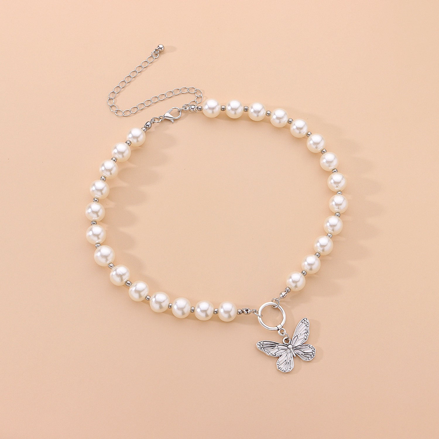 Vintage Butterfly Pendant Necklace with Imitation Pearl and Alloy Plating