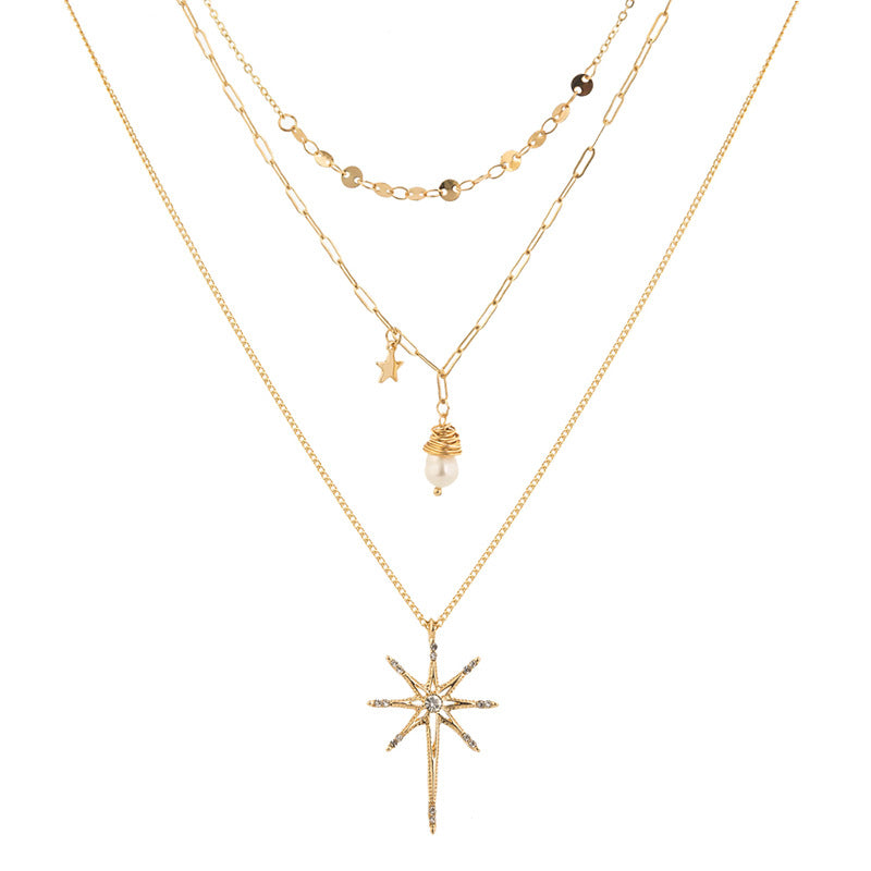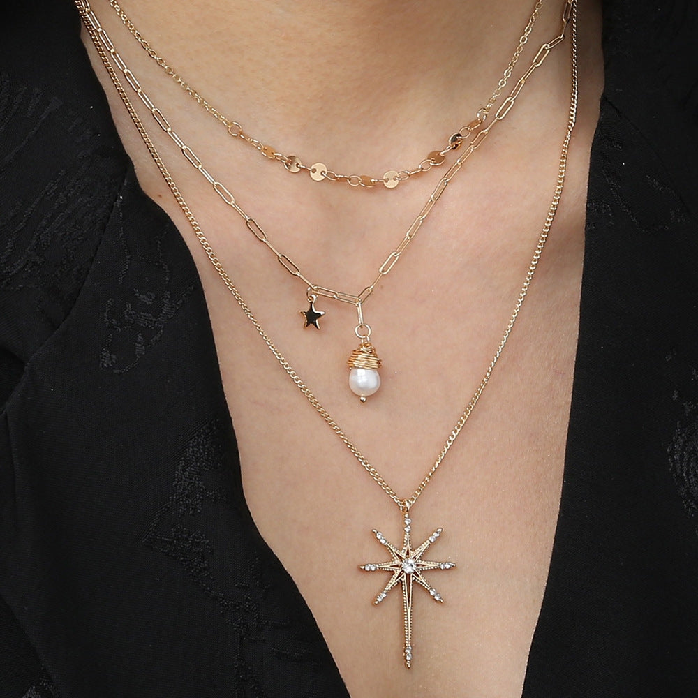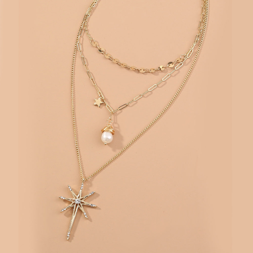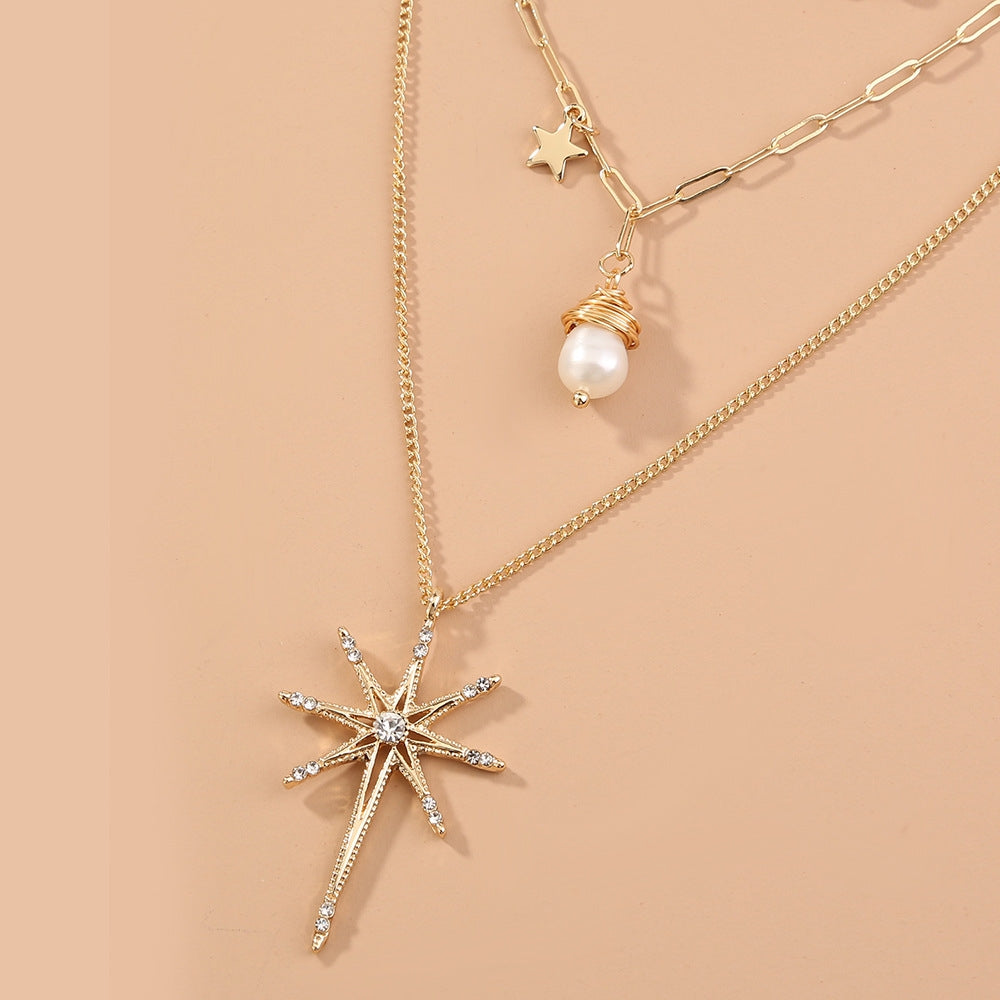 Fashion Micro-studded Skylight Star Pendant & Natural Freshwater Pearl Sunflower Multi-layer Necklace