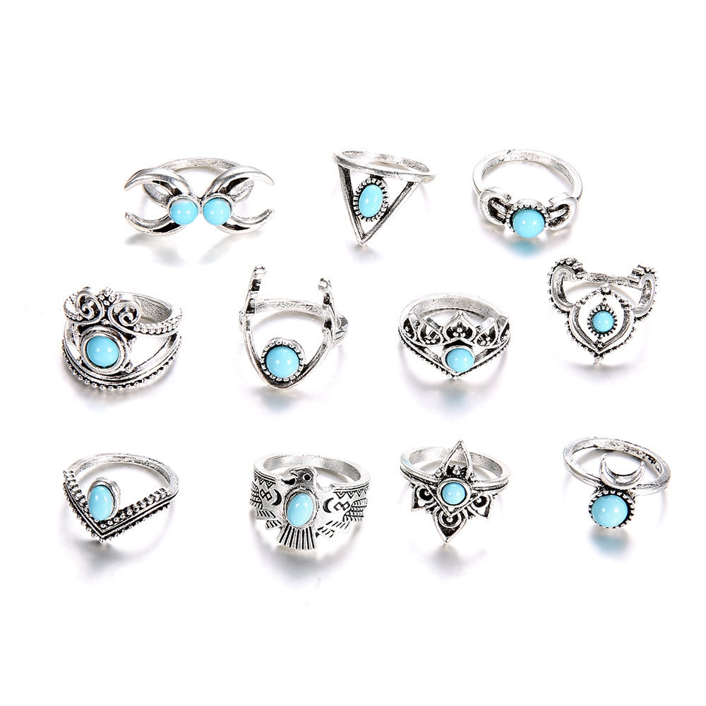 Fashion Moonstone Owl Ring Set - 11 Piece Alloy Jewelry Collection for Women