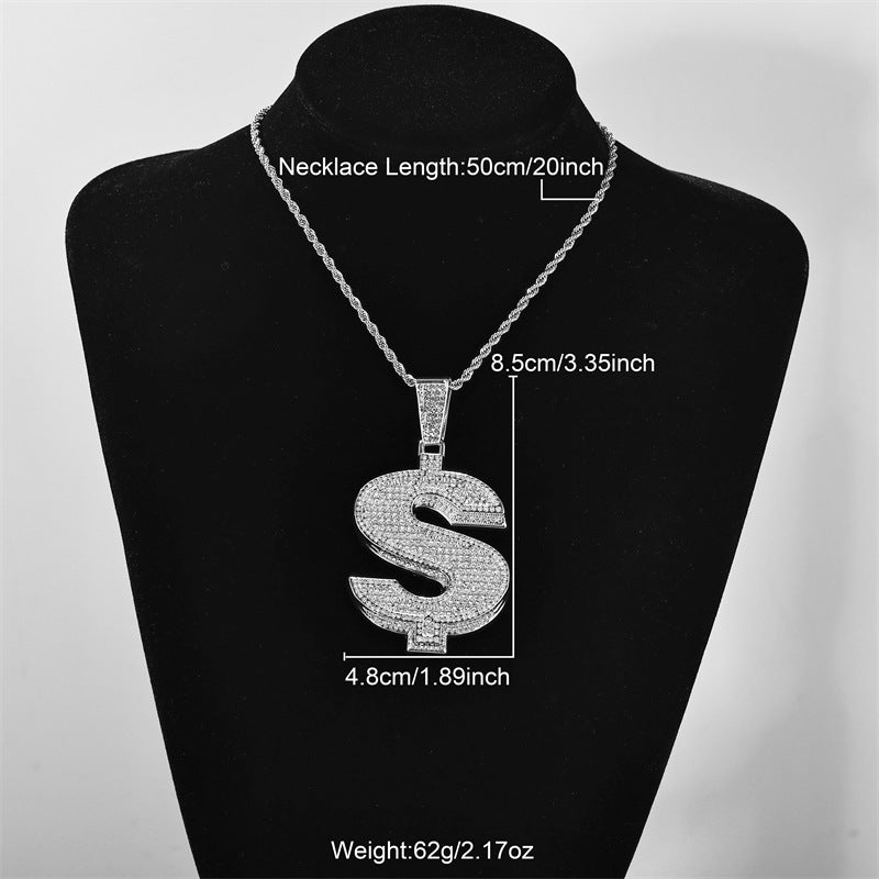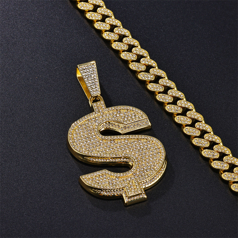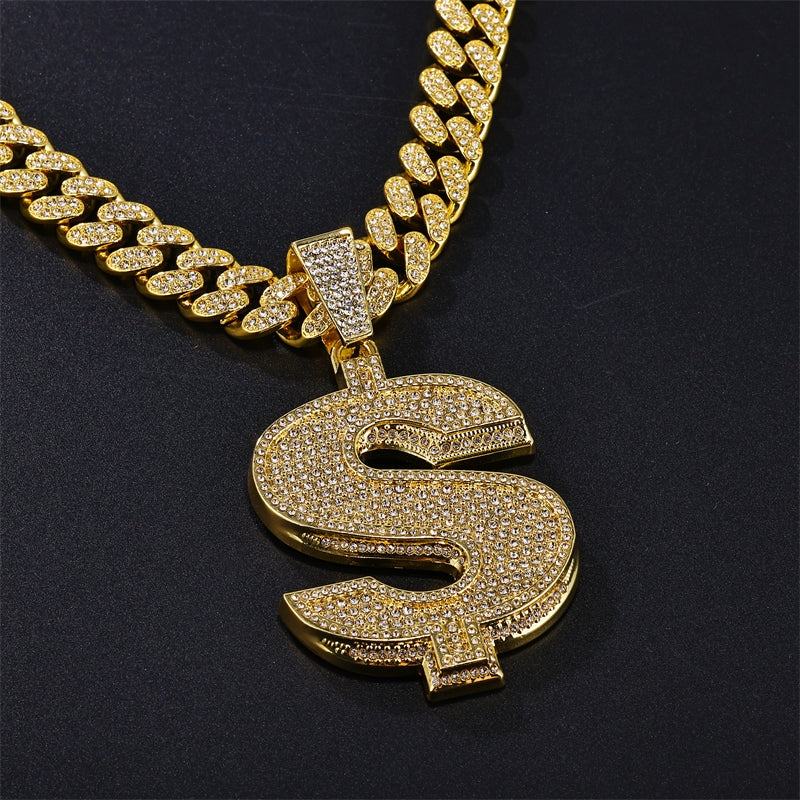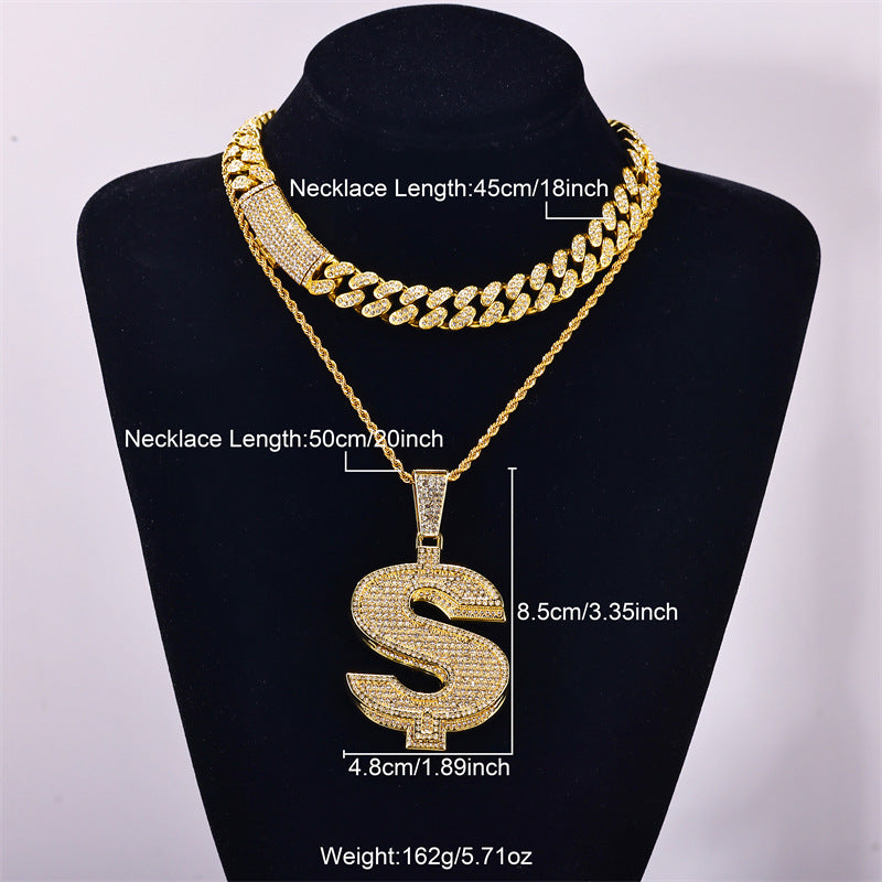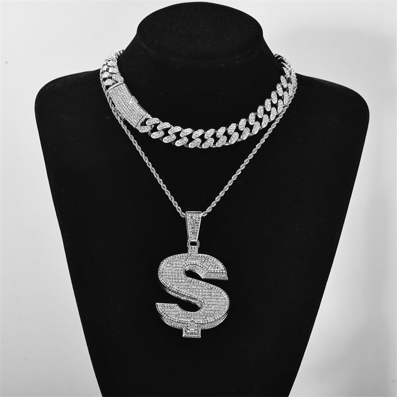 Hip-Hop Rhinestone Letter Pendant Necklace with Cuban Chain Set