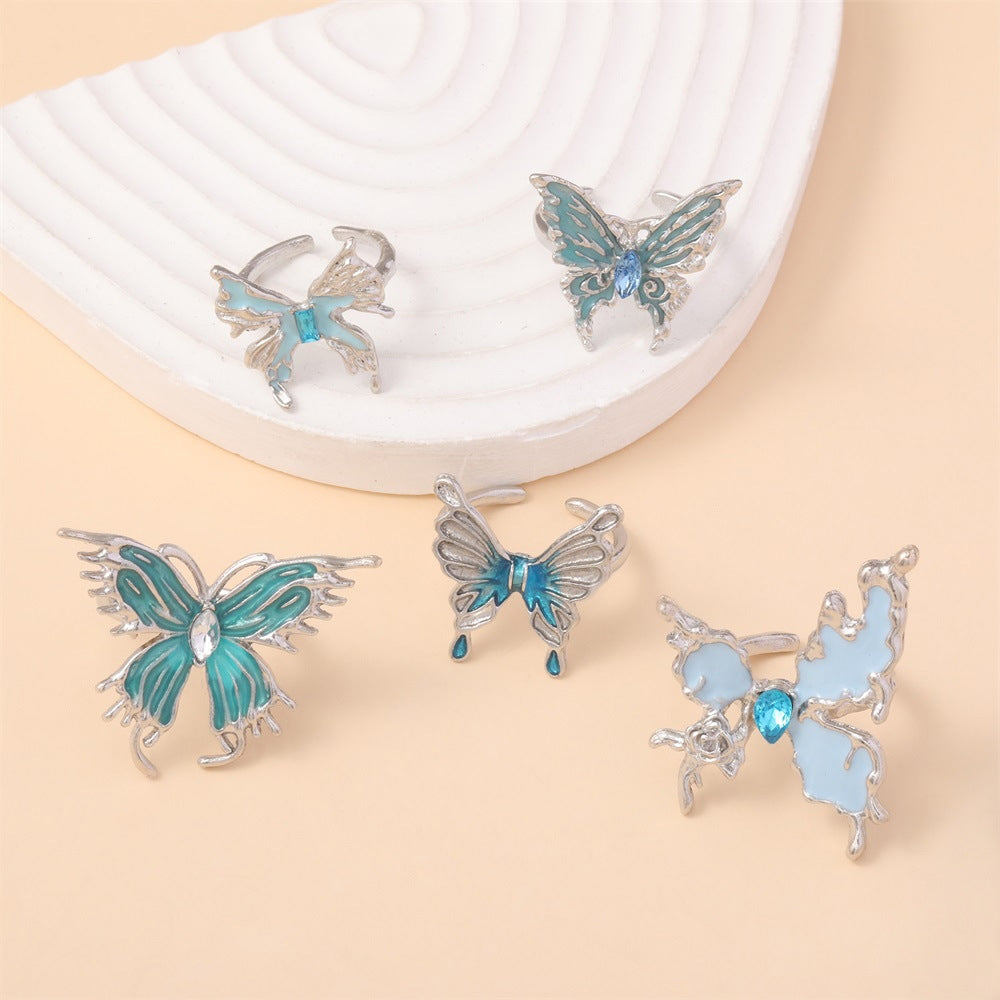 IG Style Cute Butterfly Enamel Rhinestone Silver Plated Women's Open Ring Set