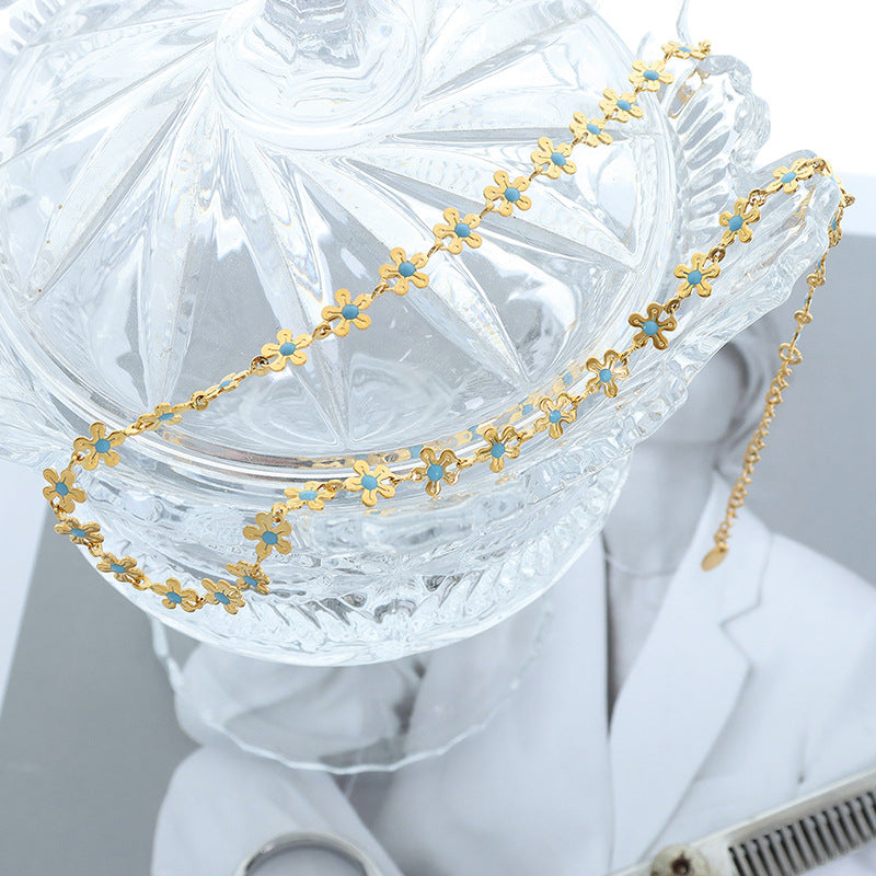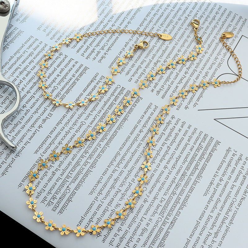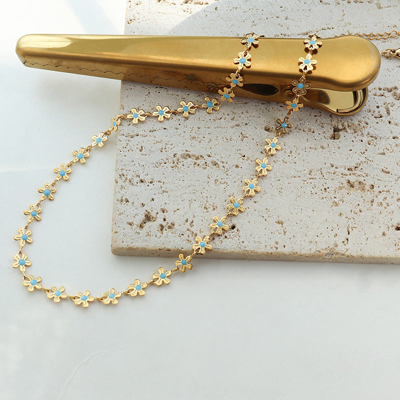 European American Gold Blue Floral Enamel Necklace and 18K Gold Plated Titanium Steel Bracelet Set