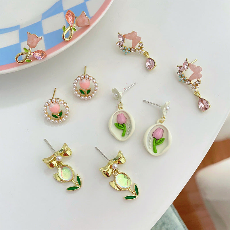 INS Style Heart Shape Flower Butterfly Enamel Rhinestone Pearl Drop Earrings for Women
