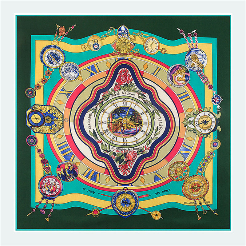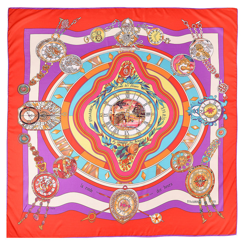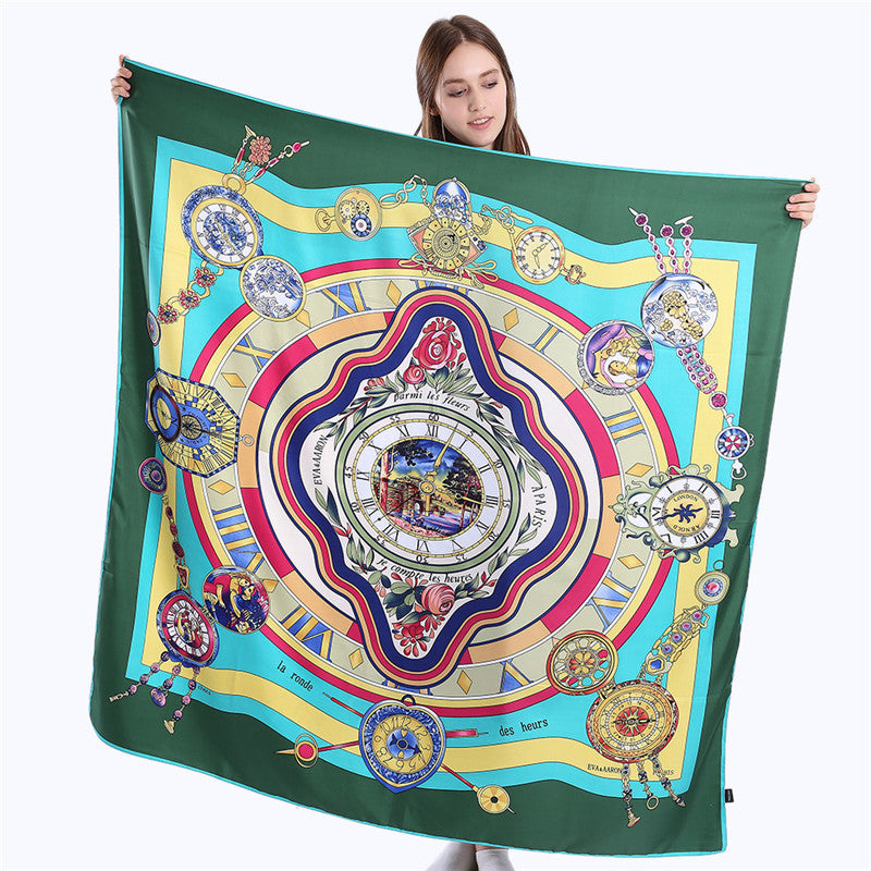 Roman Clock Print Large Silk Square Scarf - 130cm Twill Satin Shawl