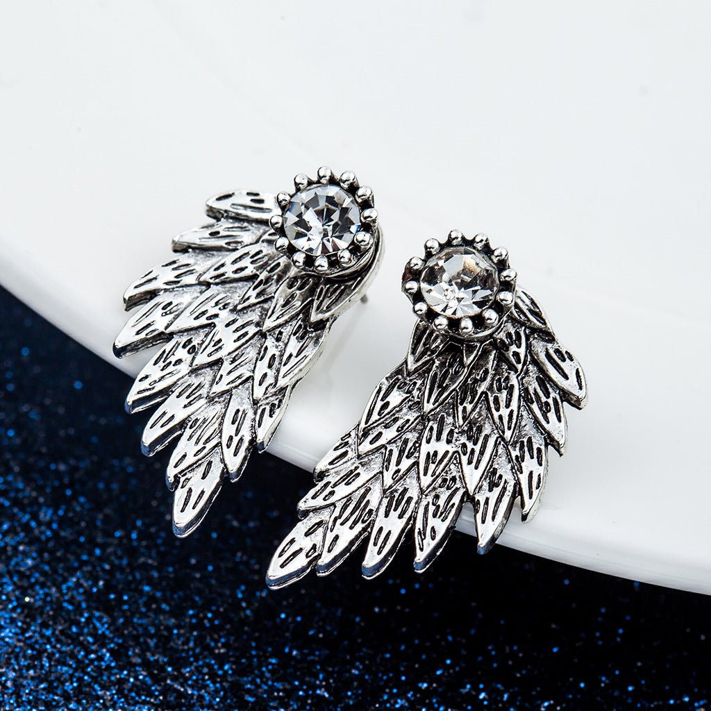 Retro Angel Wings Feather Alloy Earrings with Diamond Accents