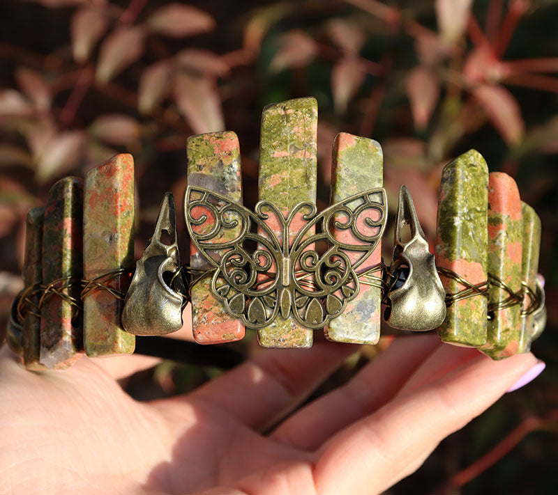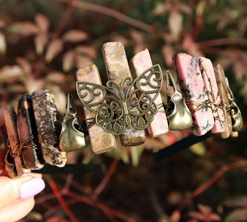 Pink quartz ancient green crow butterfly black headband + ancient bronze line