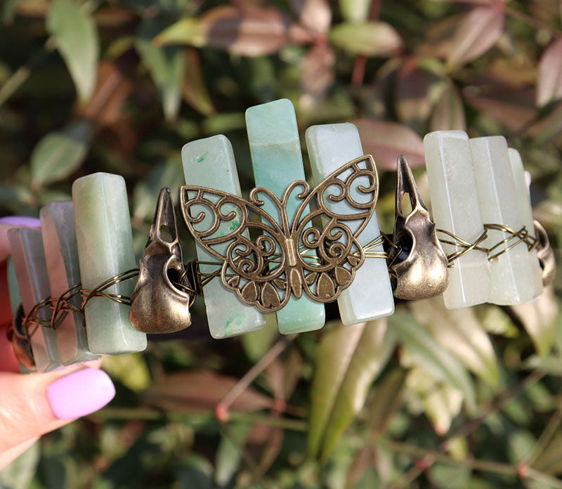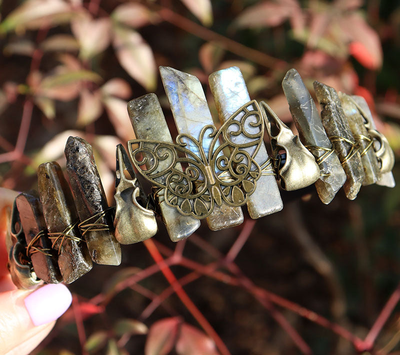 Gray labradorite, ancient green crow, butterfly, black headband + ancient bronze line