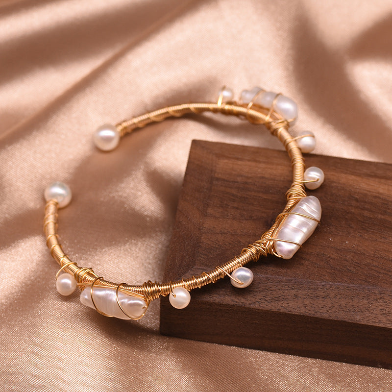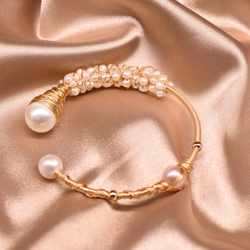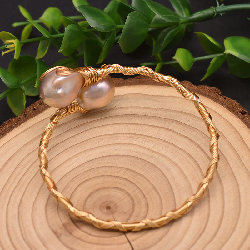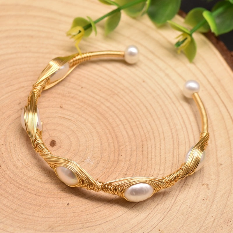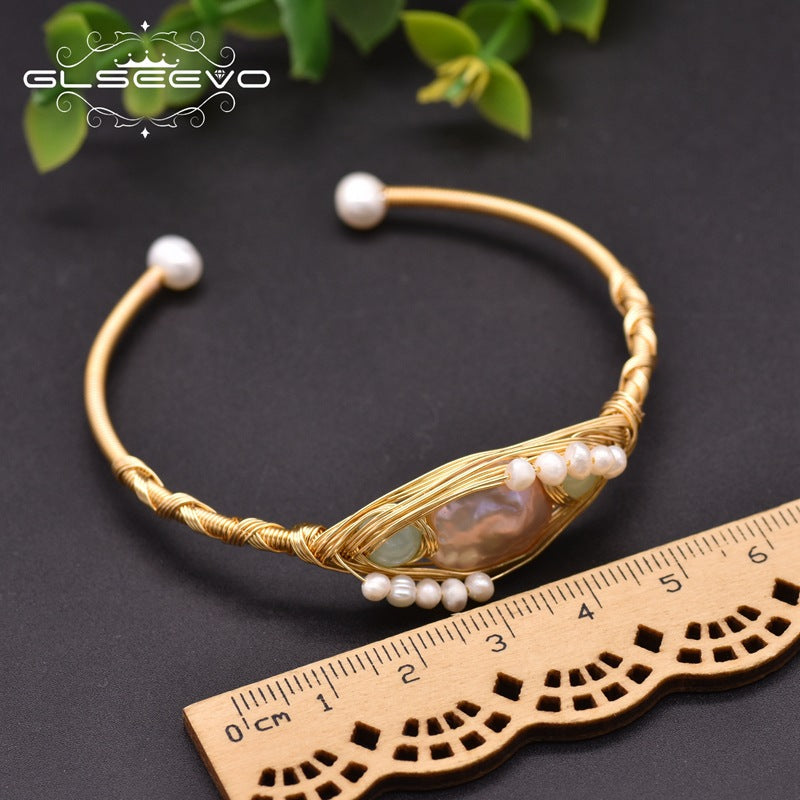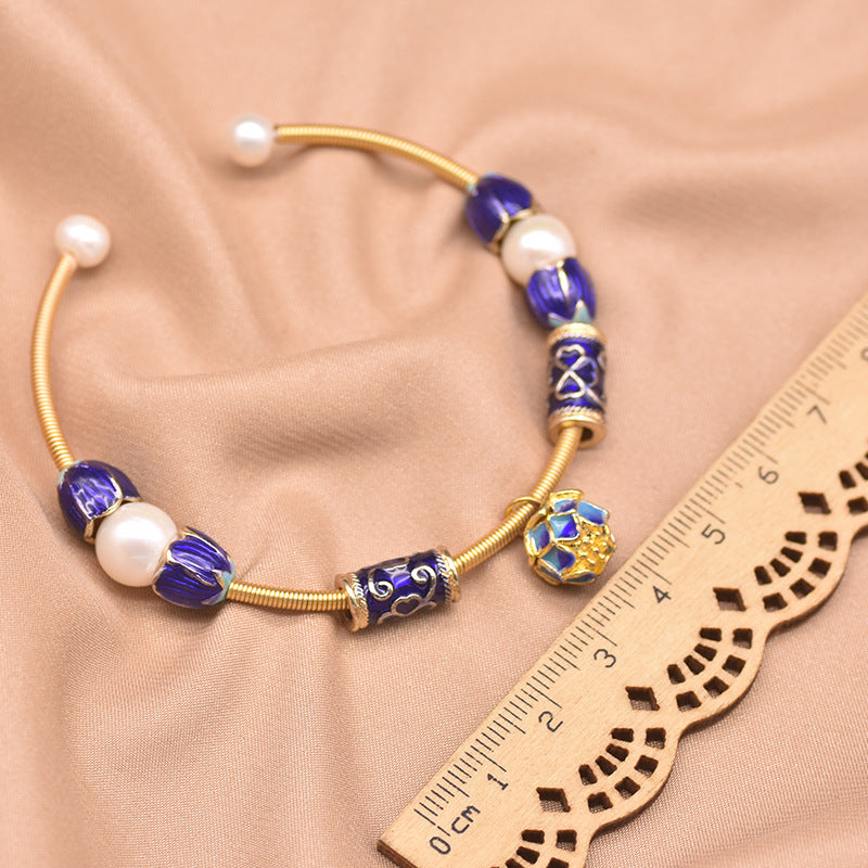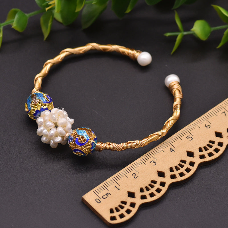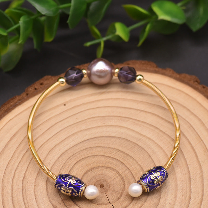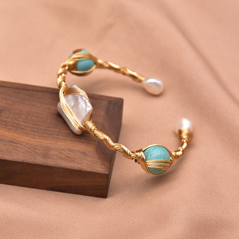 Retro Geometric Turquoise Crystal 18k Gold Plated Freshwater Pearl Bangle Bracelet