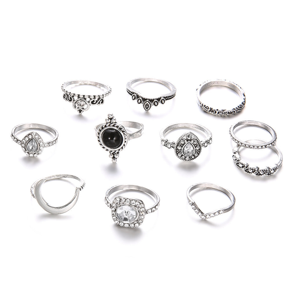 Retro Geometric Bohemian Crystal Moon Ring Set - 11 Piece Vintage Style Jewelry