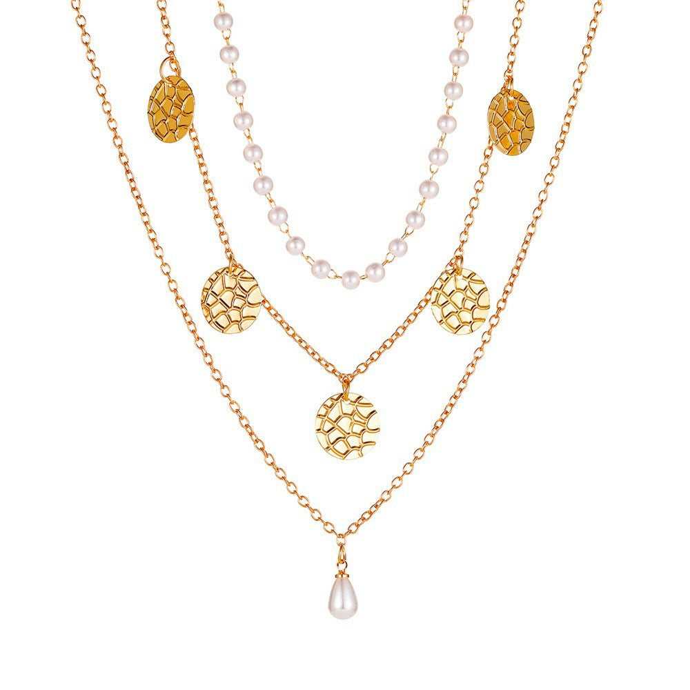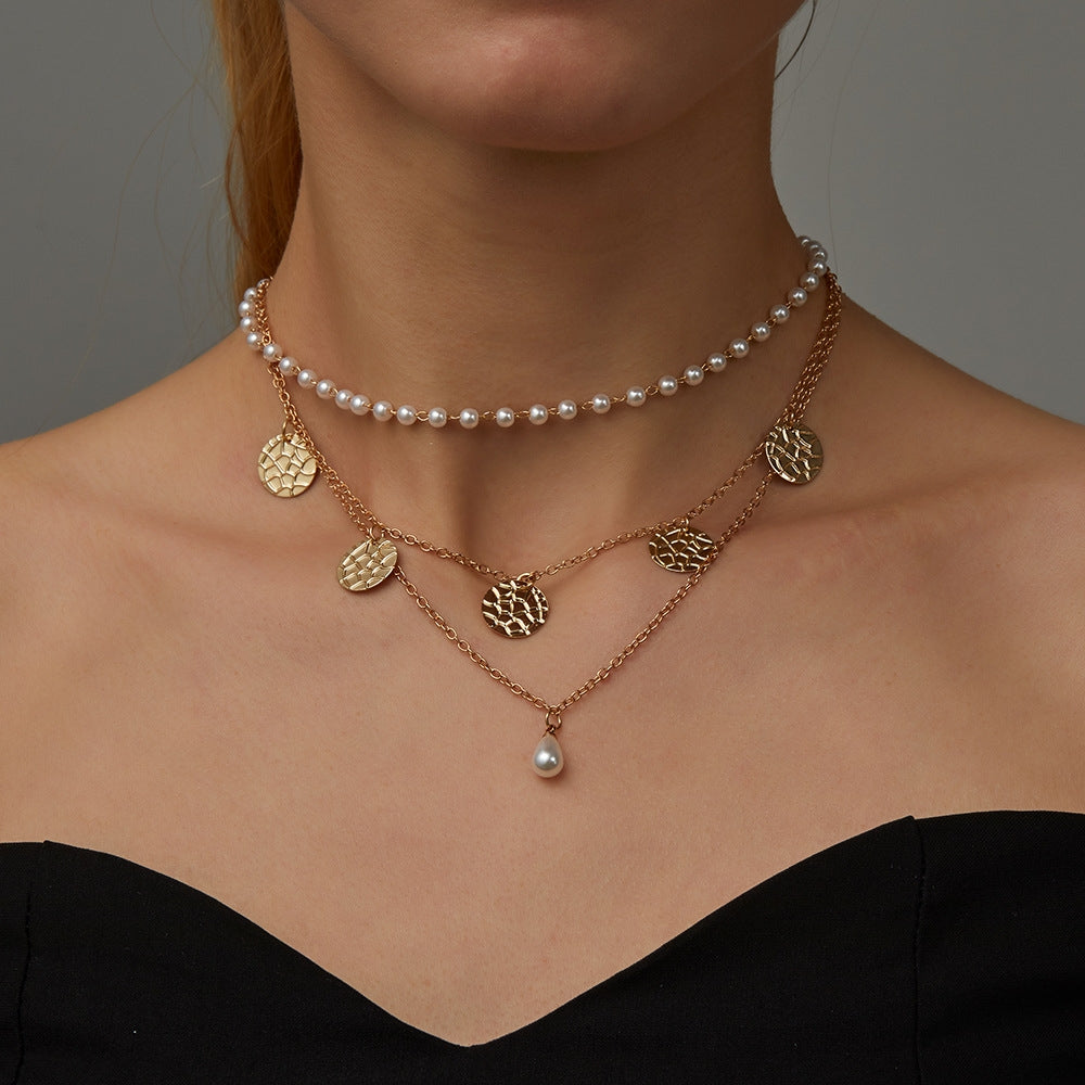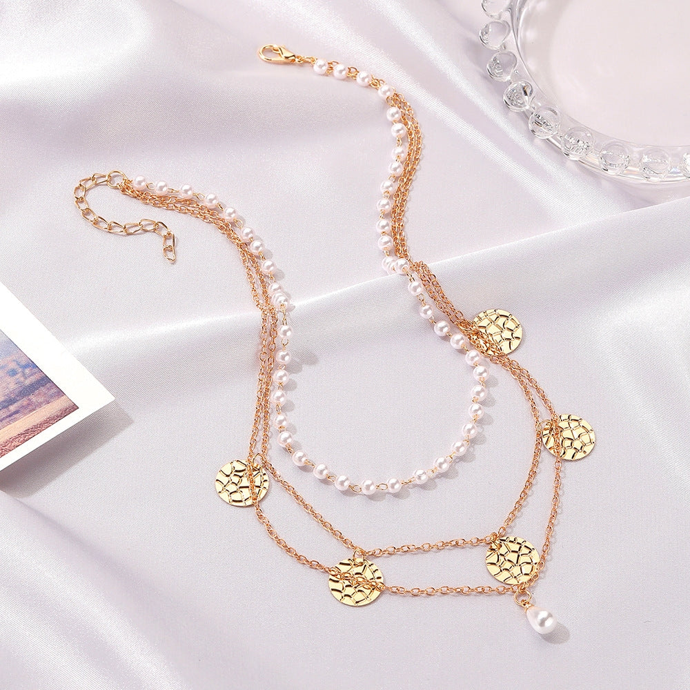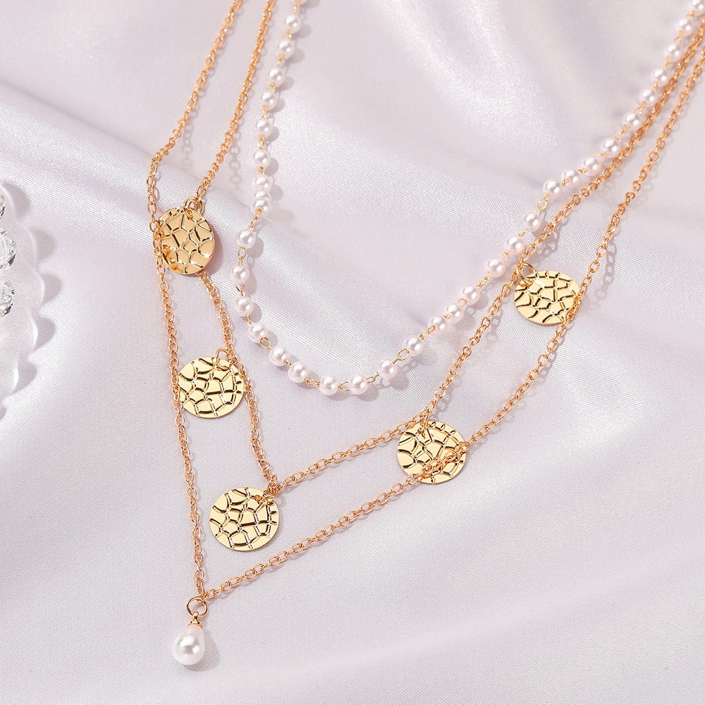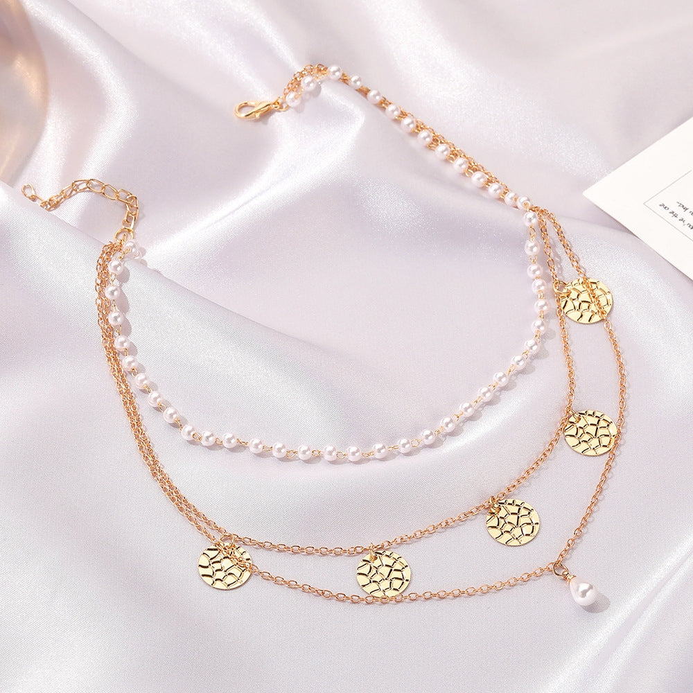 Retro Multi-Layer Pearl Disc Necklace - Vintage Minimalist Alloy Chain