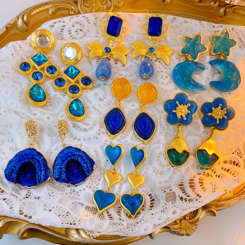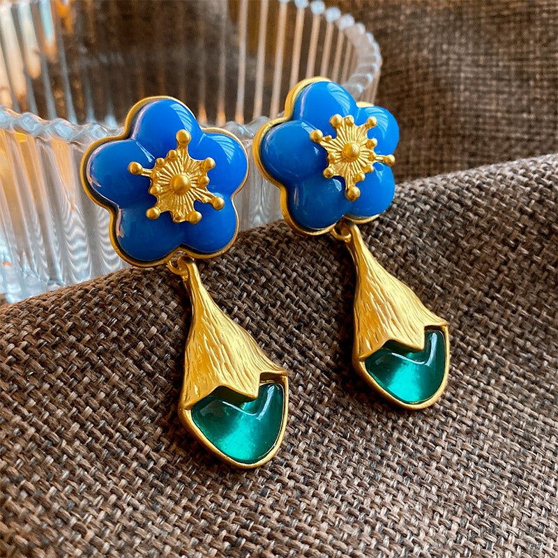 Retro Heart Flower Gemstone Drop Earrings with Geometric Bow Design
