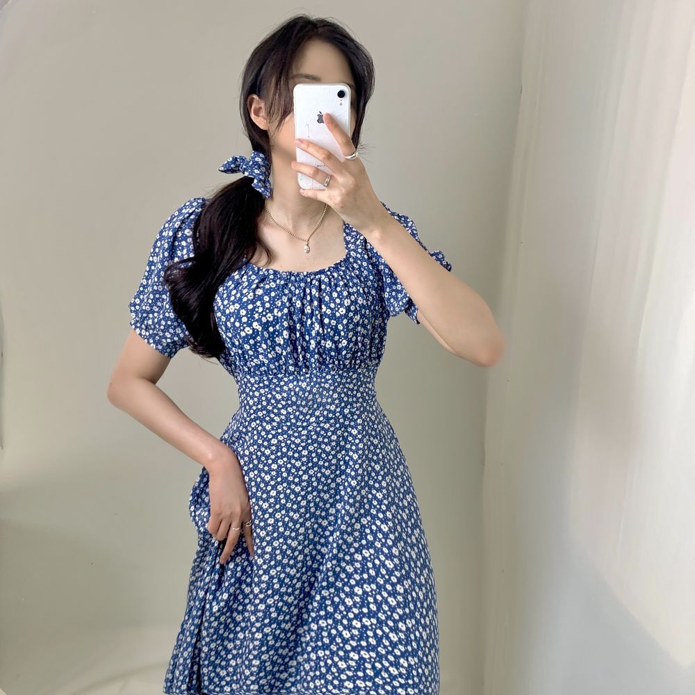 S925 Silver Needle Asymmetric Crystal Earrings & French Vintage Floral Dress Set for Women