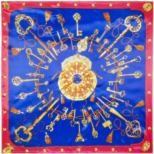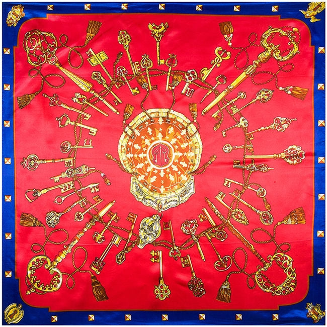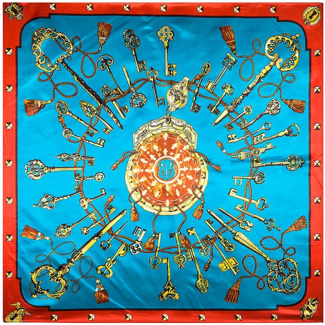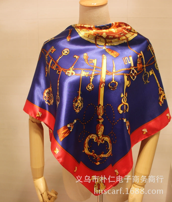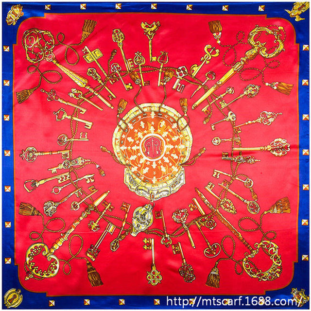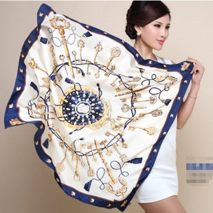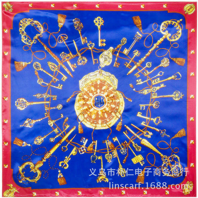 Silk Scarf with Key Pattern and Metal Chain Tassel Design - 60cm Square Satin Scarf for Women