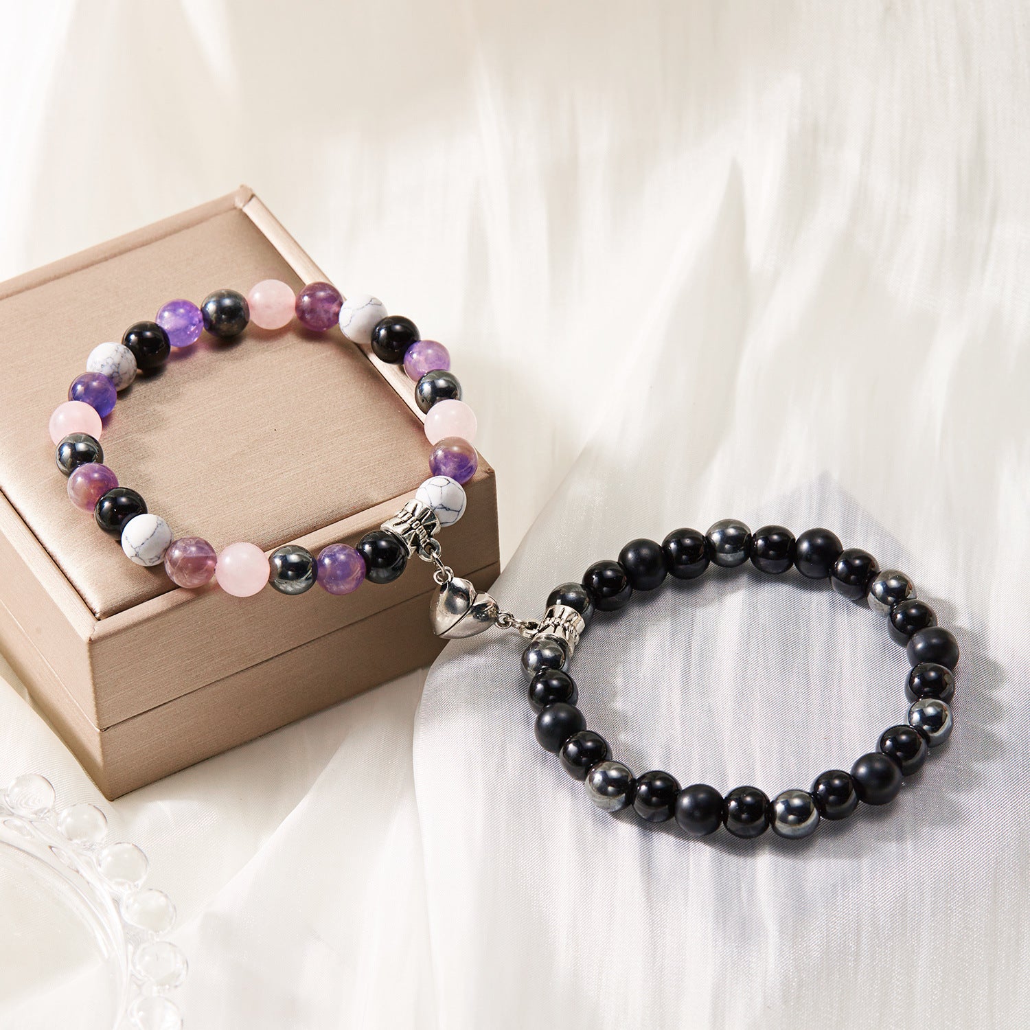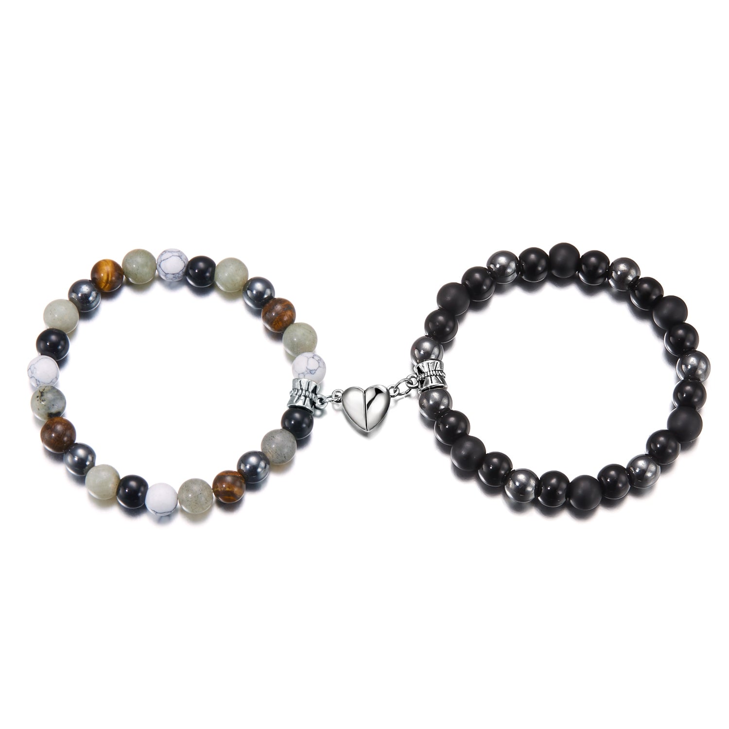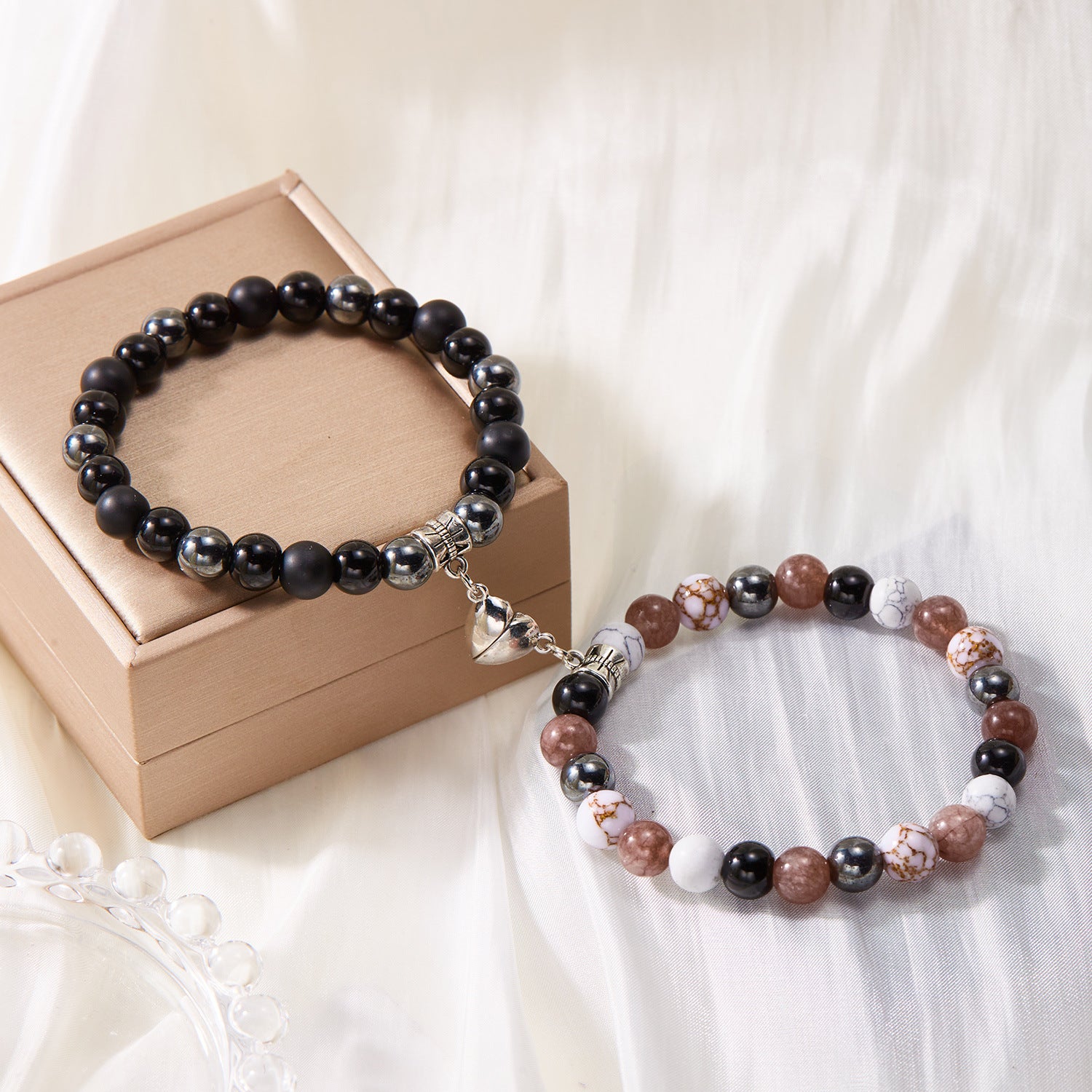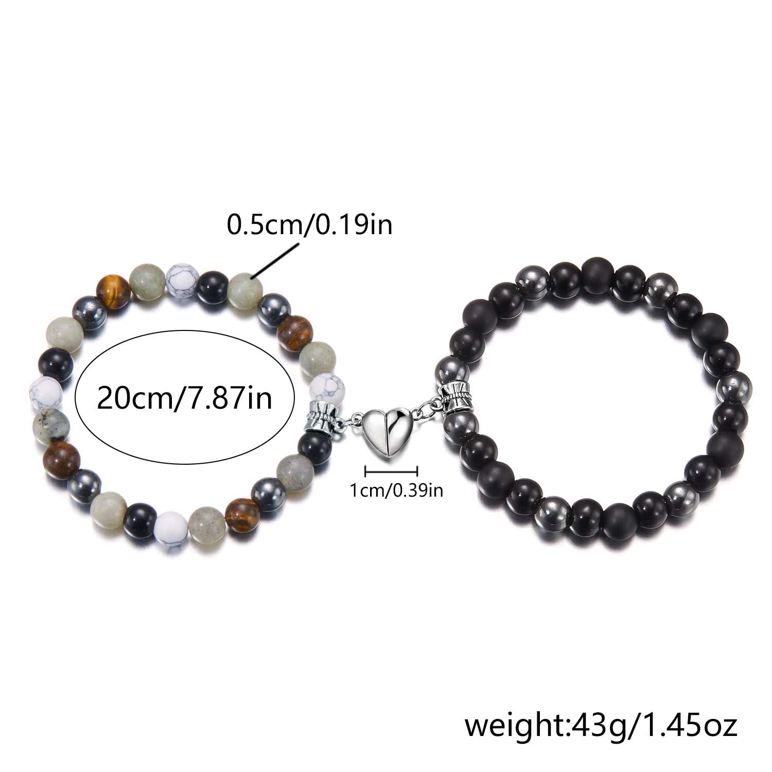 Simple Heart Shape Natural Stone Glass Beaded Unisex Couple Bracelets Set with Magnetic Attraction