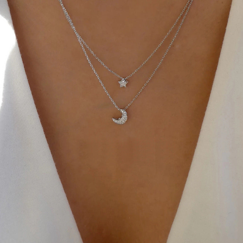 Layered Star and Moon Pendant Necklace - Fashion Alloy Jewelry for Women