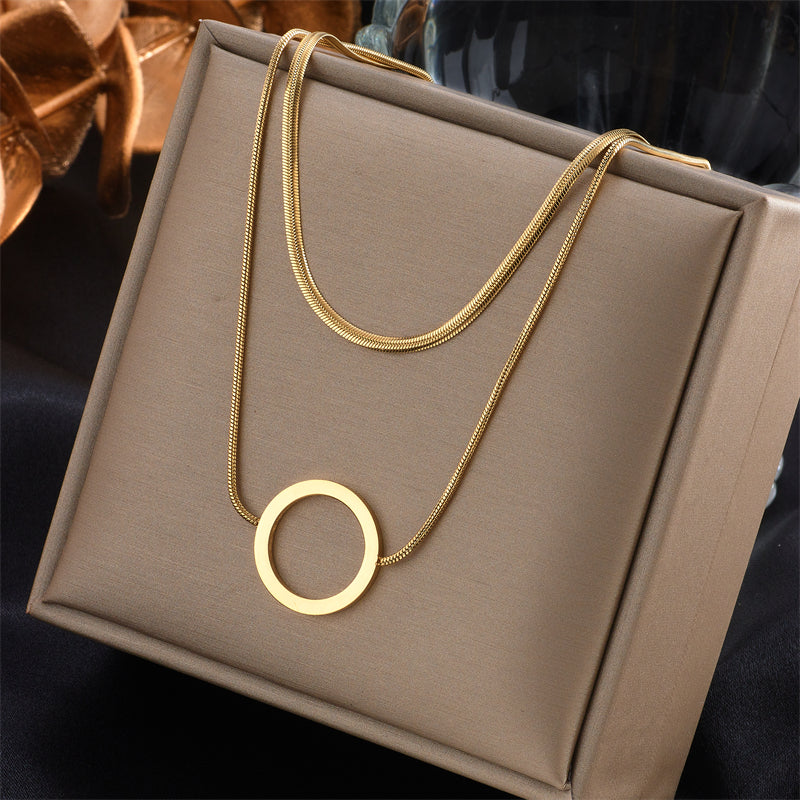 Gold Plated Stainless Steel Layered Snake Chain Circle Pendant Necklace